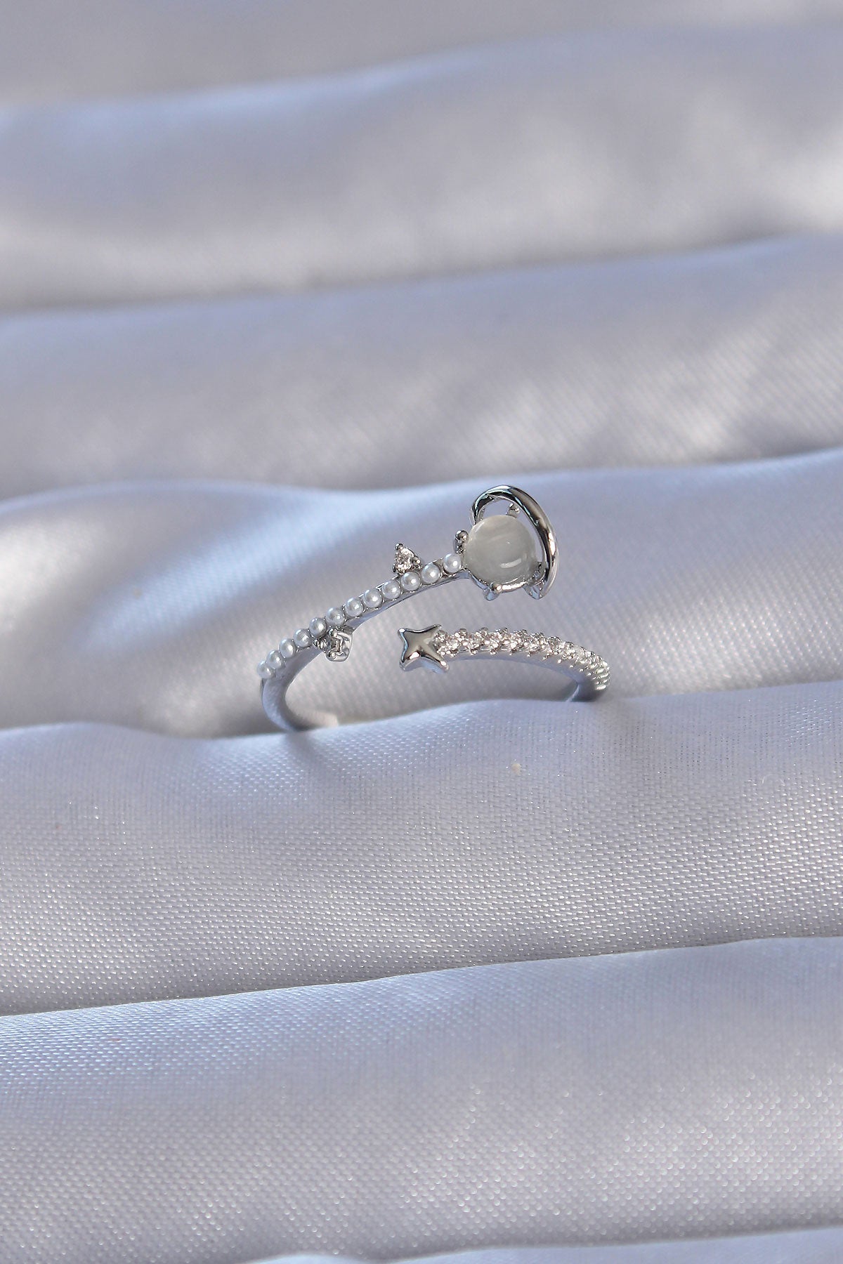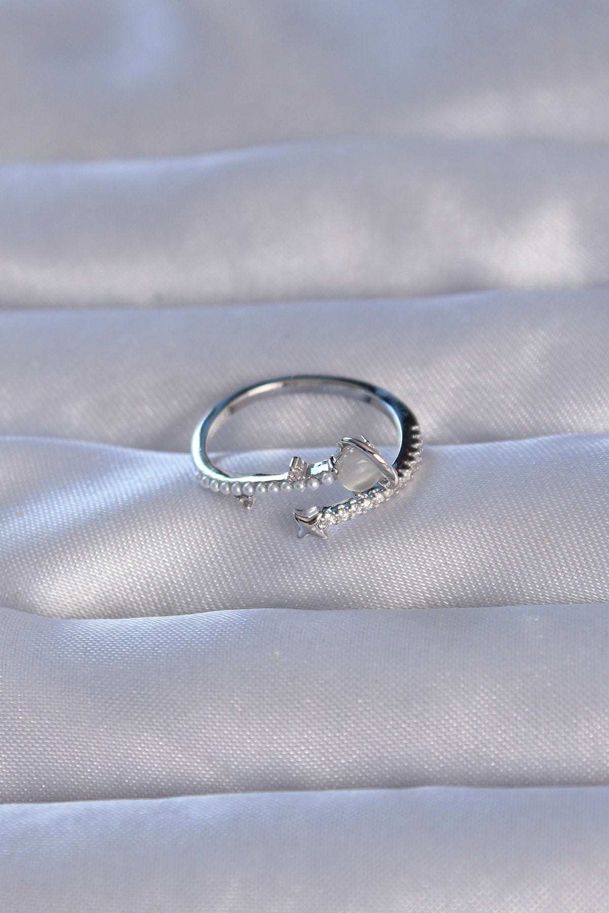 BYK3222 - Pirinç Gümüş Renk Zirkon Taşlı İncili Satürn Model Ayarlanabilir Yüzük