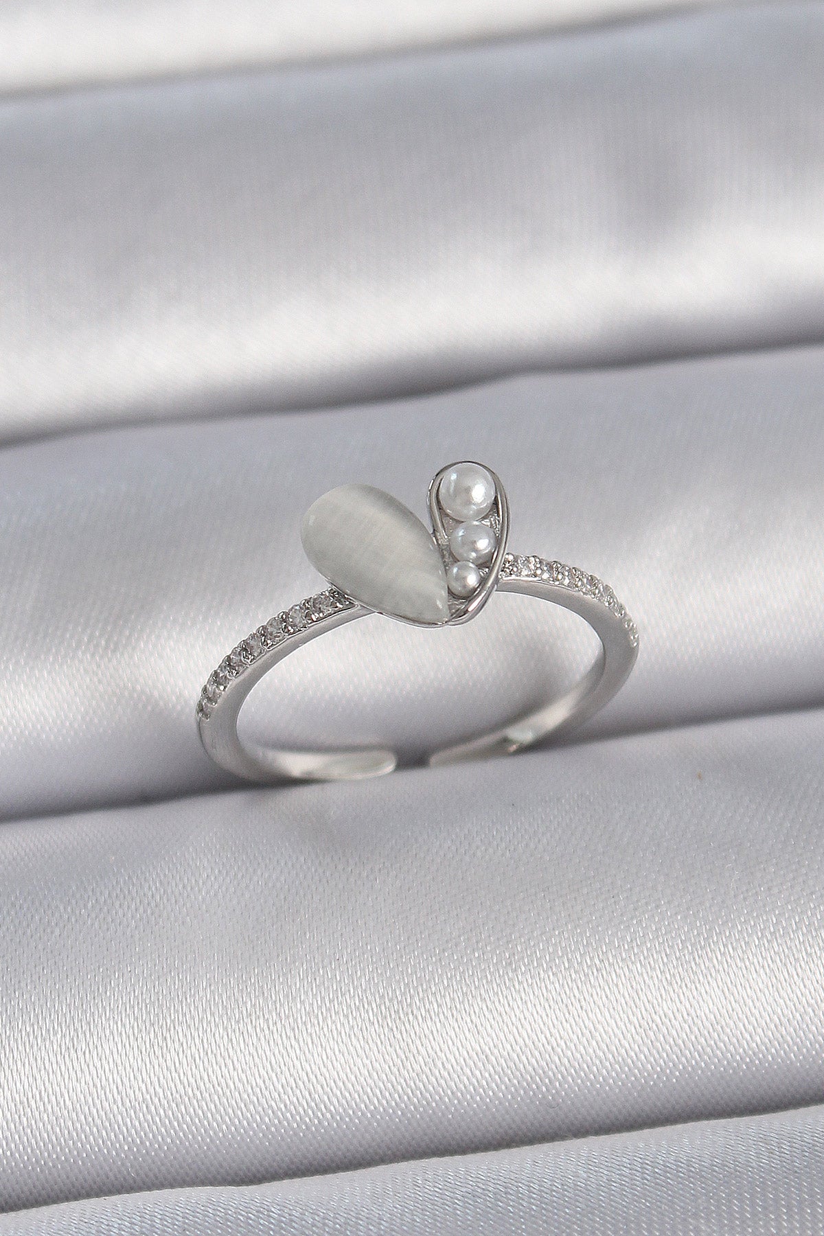 BYK3377 - Pirinç Gümüş Renk Ayarlanabilir Zirkon Taşlı İncili Beyaz Mineli Kalp Model Kadın Yüzük
