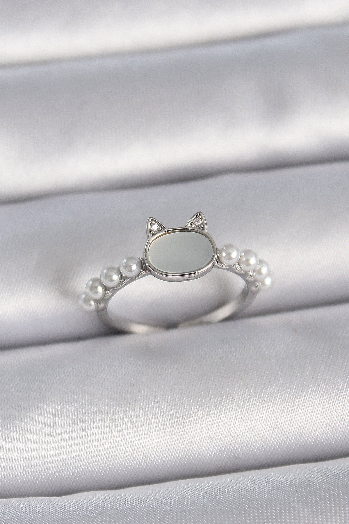 BYK3387 - Pirinç Gümüş Renk Ayarlanabilir Beyaz Mineli Kedi Model İnci Detay Kadın Yüzük