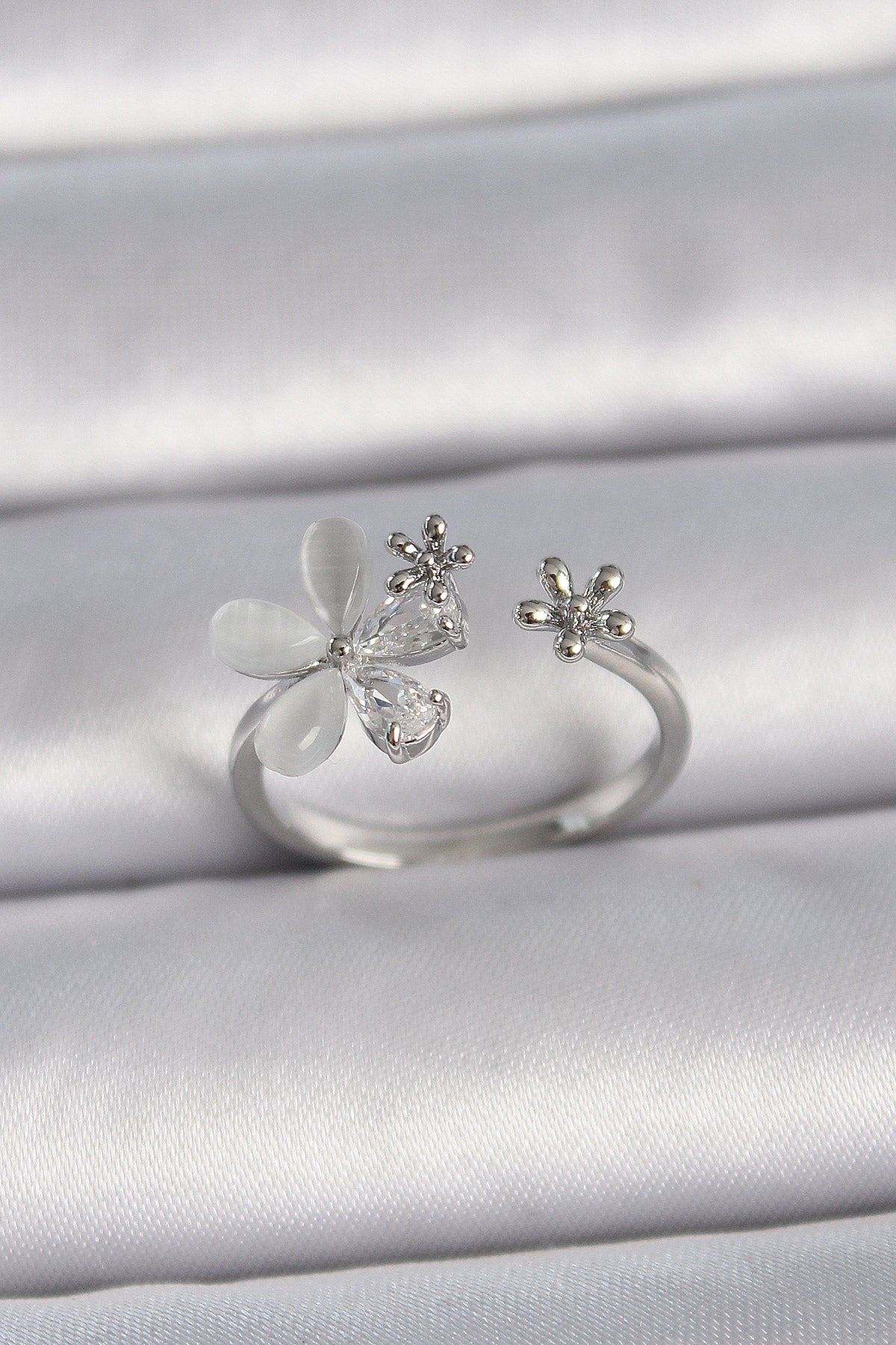 BYK3399 - Pirinç Gümüş Renk Ayarlanabilir Zirkon Taşlı Beyaz Mineli Yaprak Model Kadın Yüzük