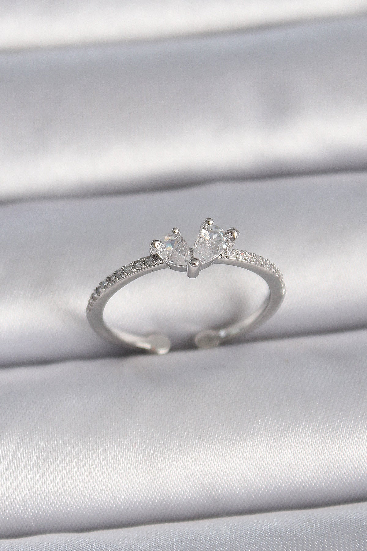 BYK3407 - Pirinç Gümüş Renk Ayaralanabilir Zirkon Taşlı Kalp Model Kadın Yüzük