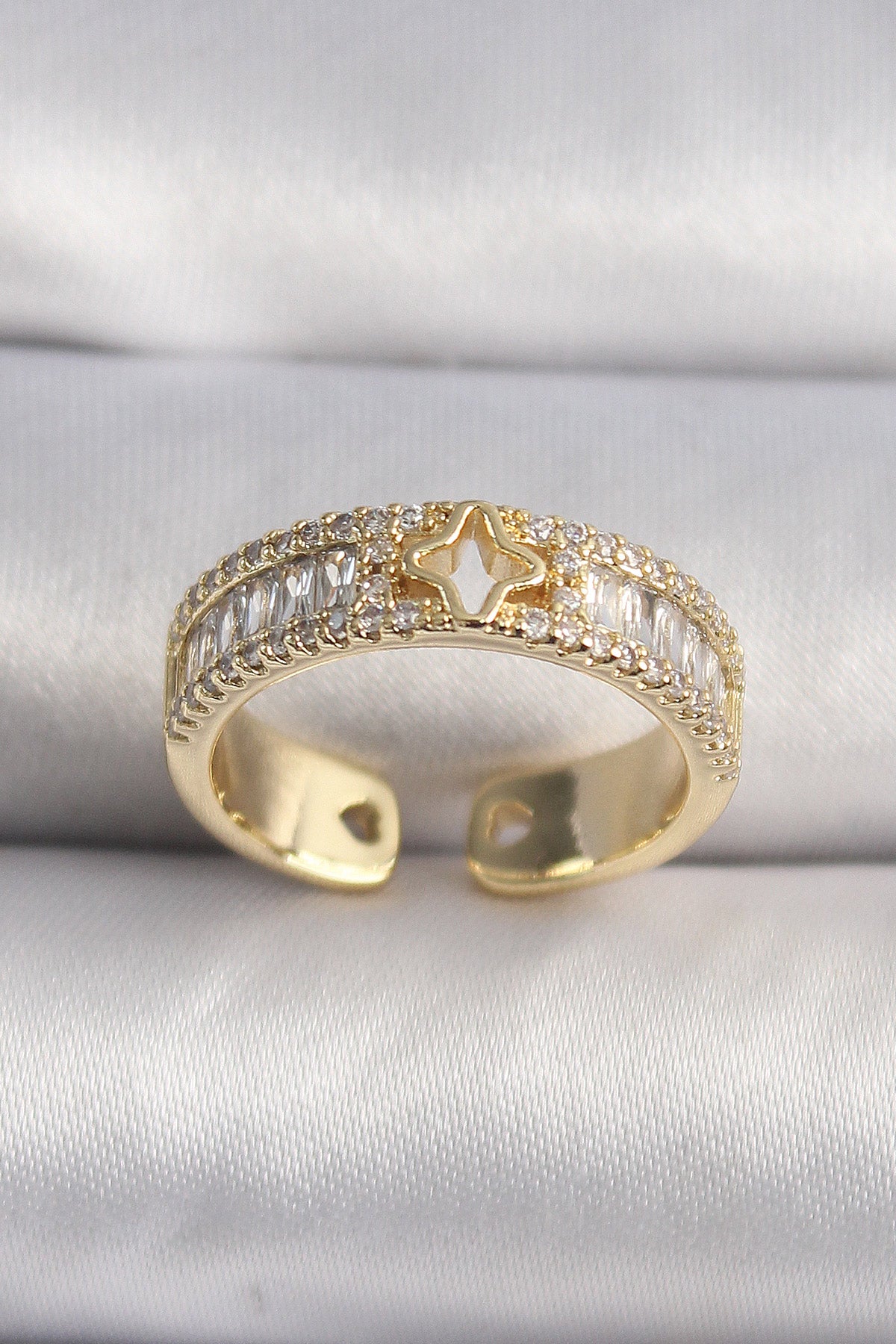 BYK3510 - Pirinç Gold Renk Zirkon Taşlı Yıldız İşleme VIP Seri Kadın Yüzük