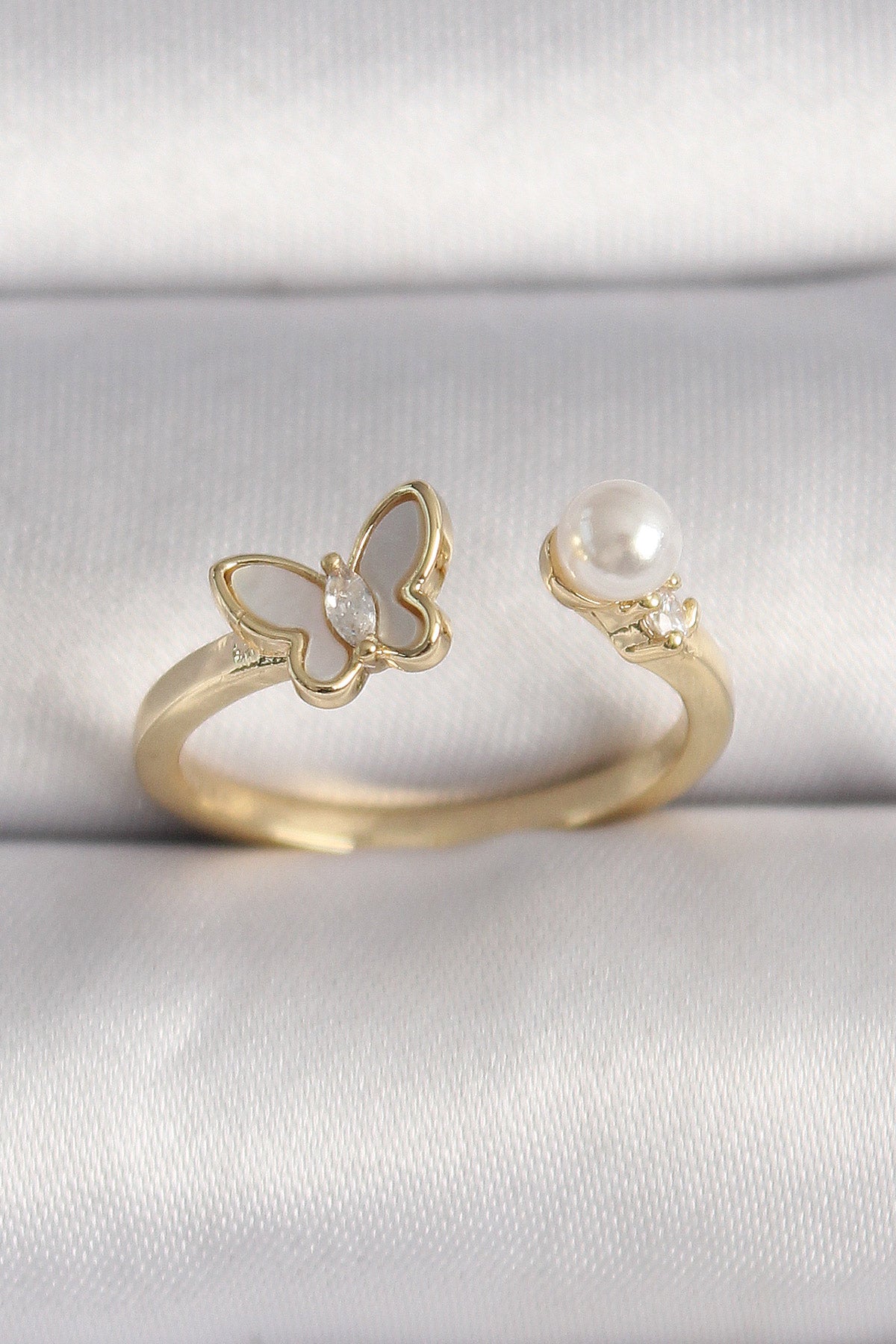 BYK3523 - Pirinç Gold Renk Zirkon Taş Detaylı Beyaz Mineli Kelebek Model İnci Detay Ayarlanabilir Yüzük