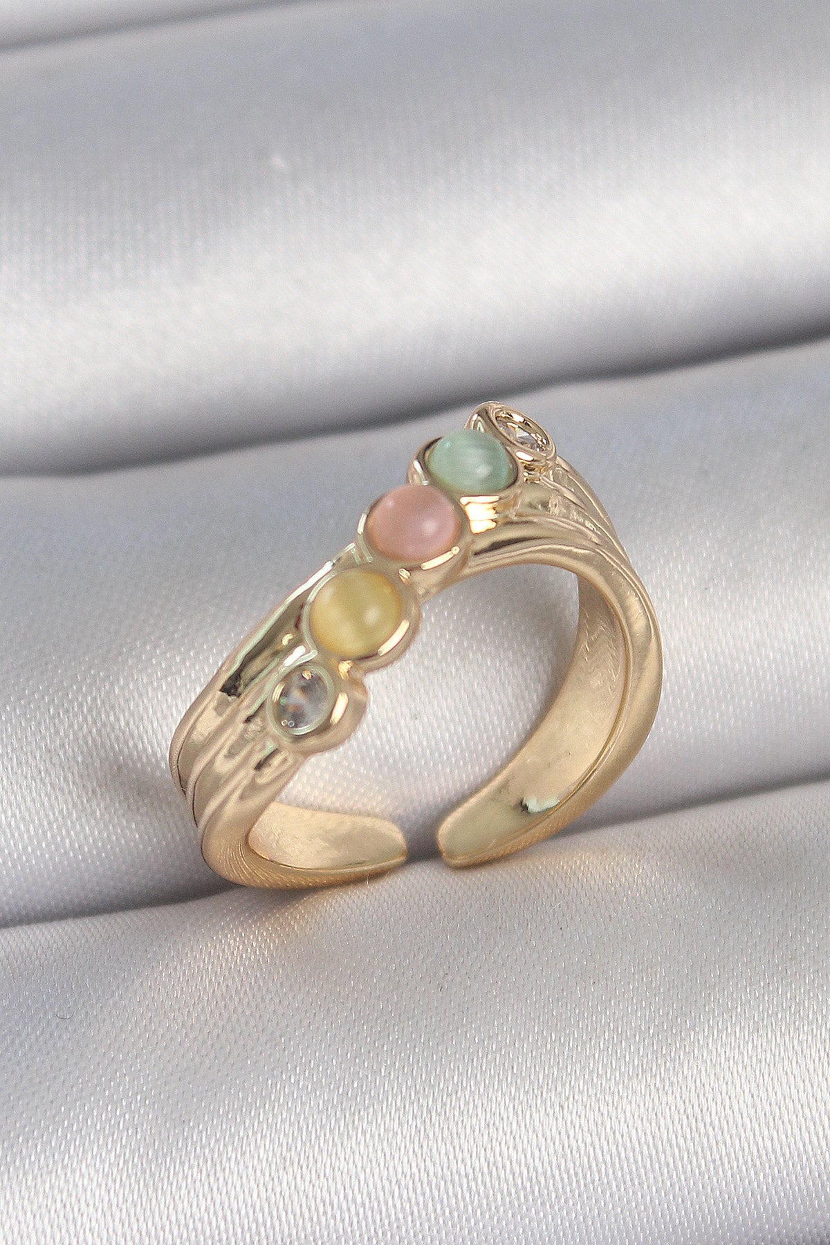 BYK3729 - Pirinç Gold Renk Zirkon Taş Detaylı Karışık Mineli Ayarlanabilir Kadın Yüzük