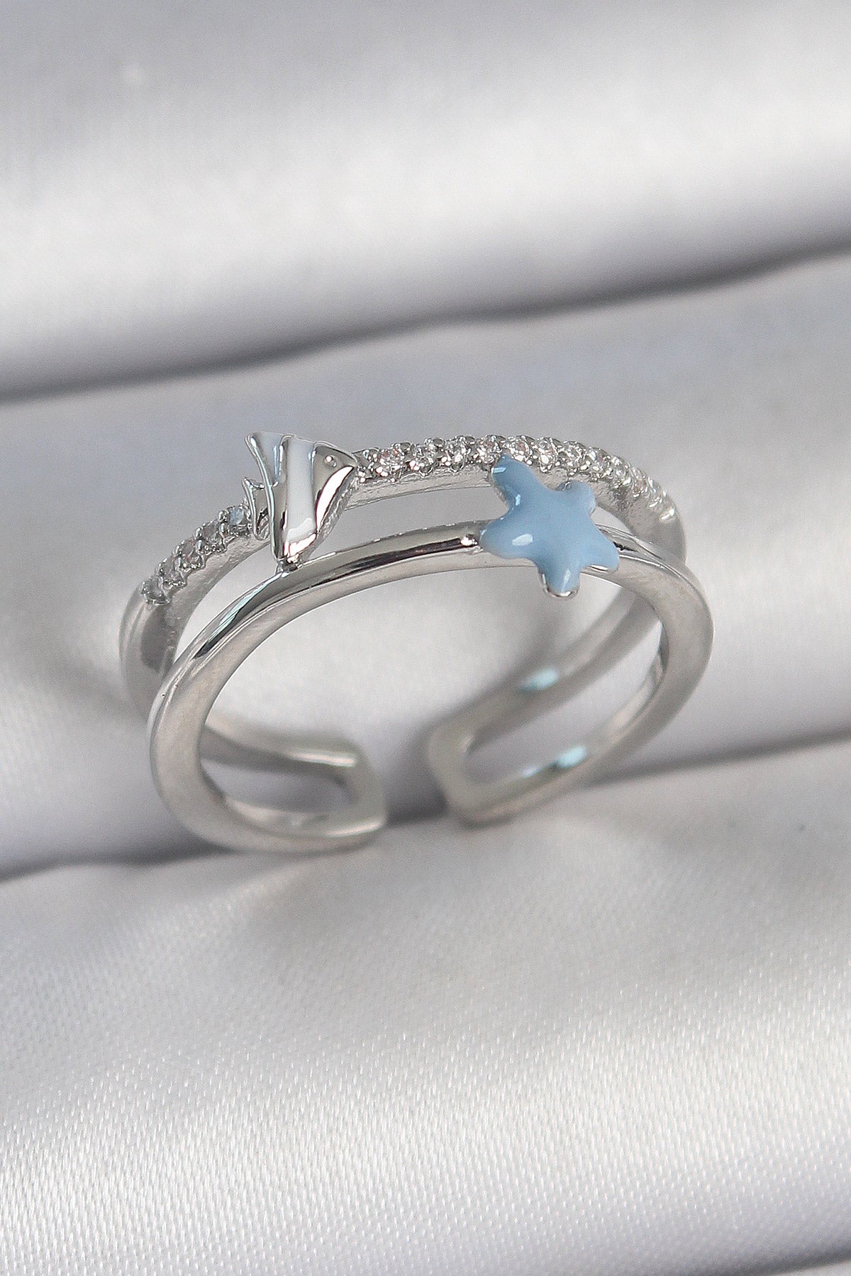 BYK3738 - Pirinç Gümüş Renk 2'Li Zirkon Taşlı Mavi Yıldız Figür Ayarlanabilir Kadın Yüzük