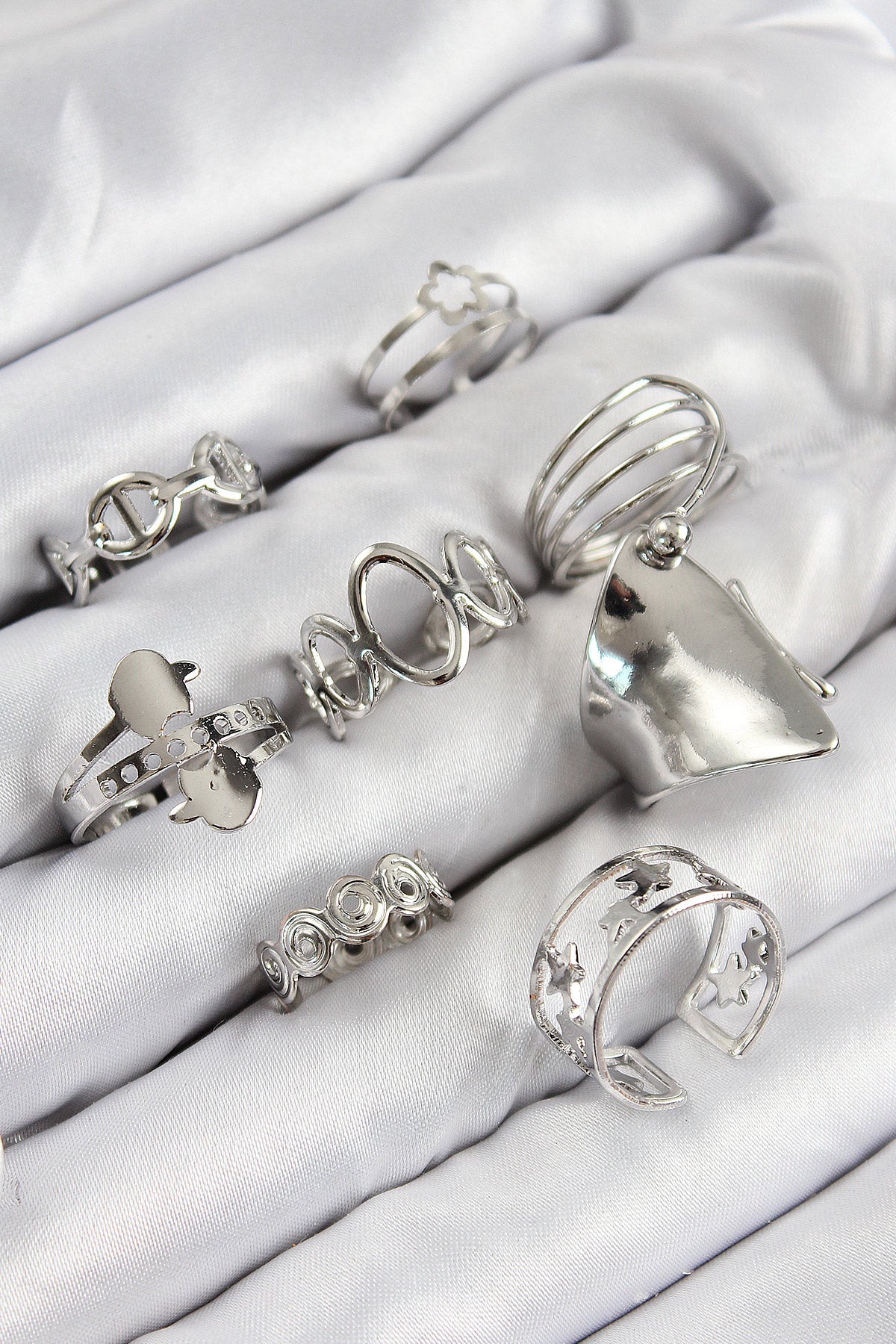 BYK3812 - Pirinç Sarmal Ve Yıldız Model Gümüş Renk Kadın Yüzük Kombin Set