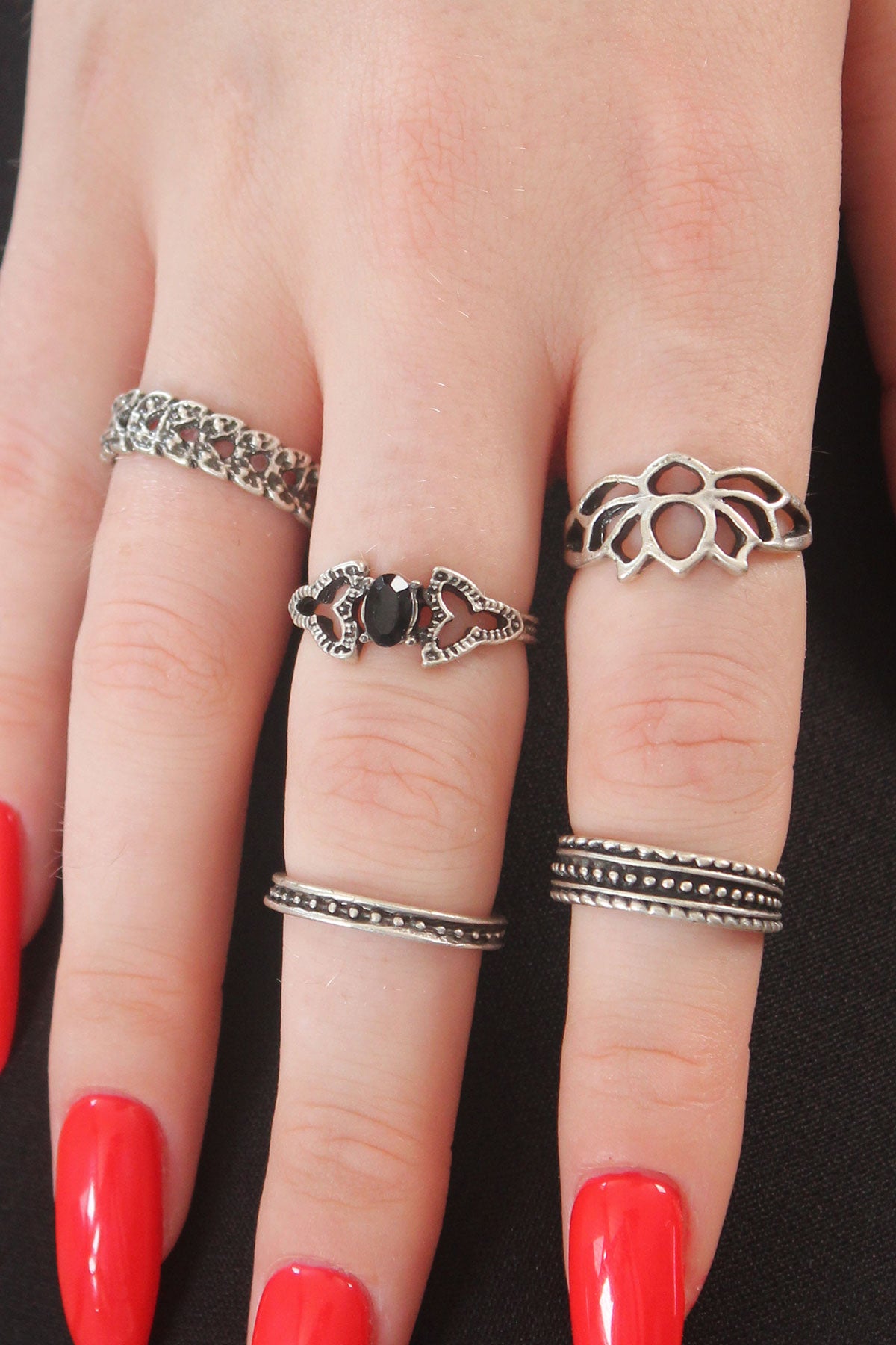 Gümüş Renk Lotus Model Siyah Kristal Taş Detay Bayan Yüzük Kombin - BYK2740