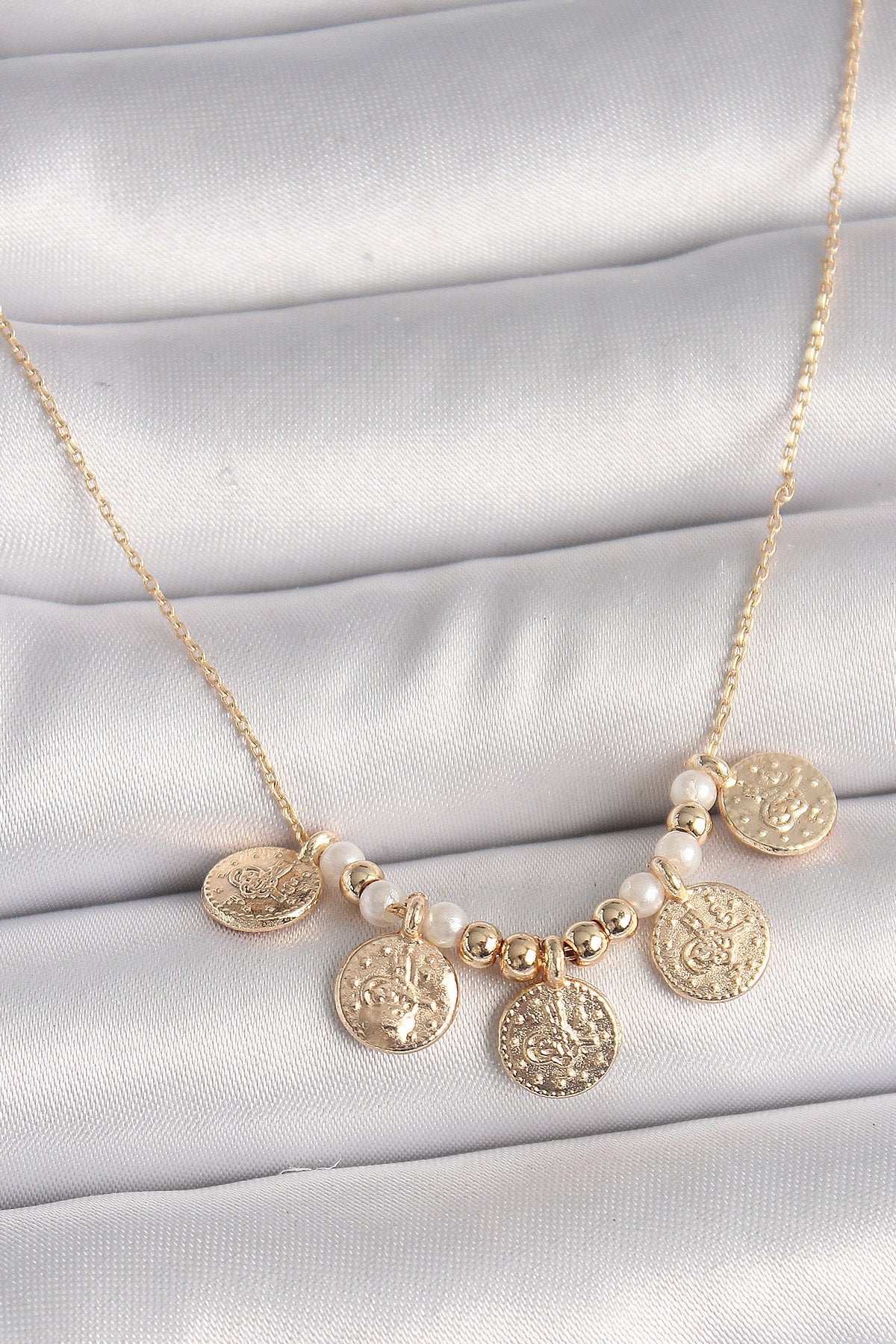 Pirinç Gold Renk 5'Li Osmanlı Tuğra Figür İnci Detay Kadın Kolye