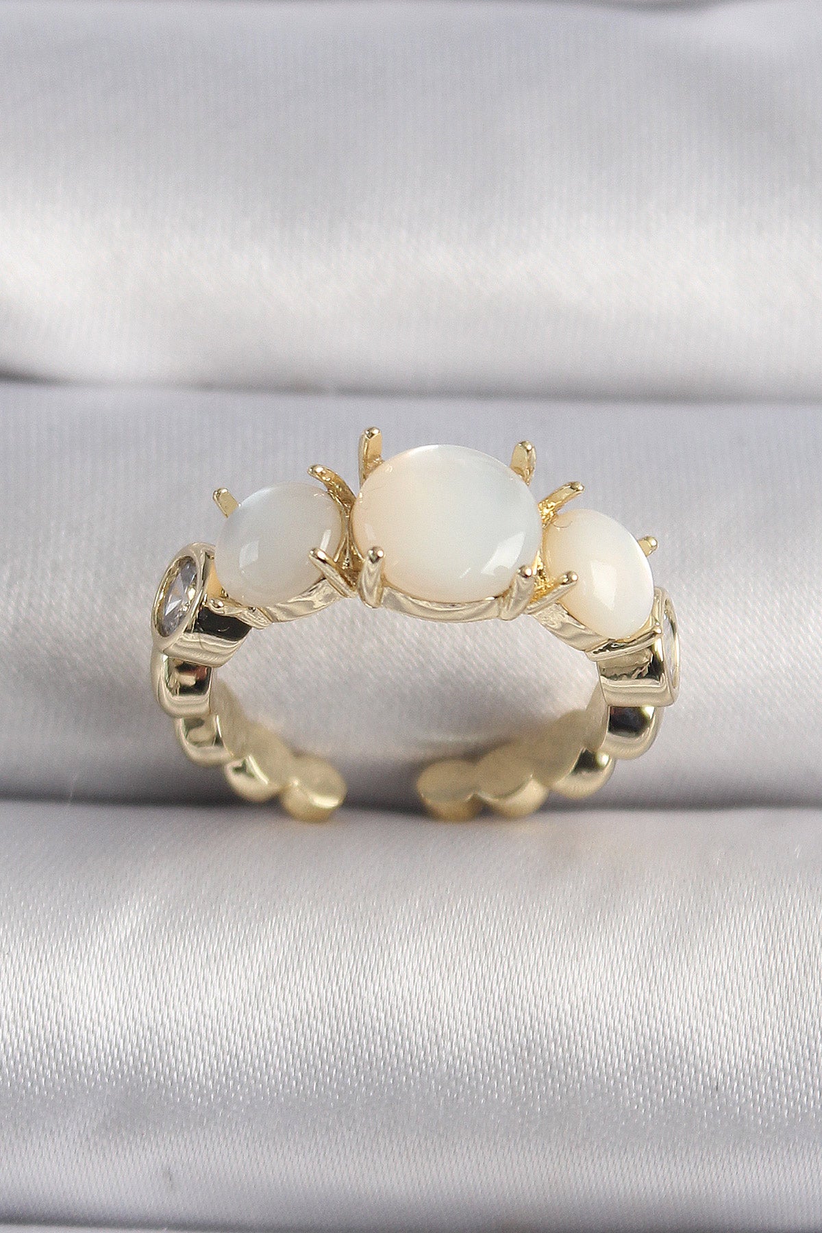 Pirinç Gold Renk Zirkon Taş Detaylı Beyaz Sedefli VIP Seri Kadın Yüzük - BYK3504