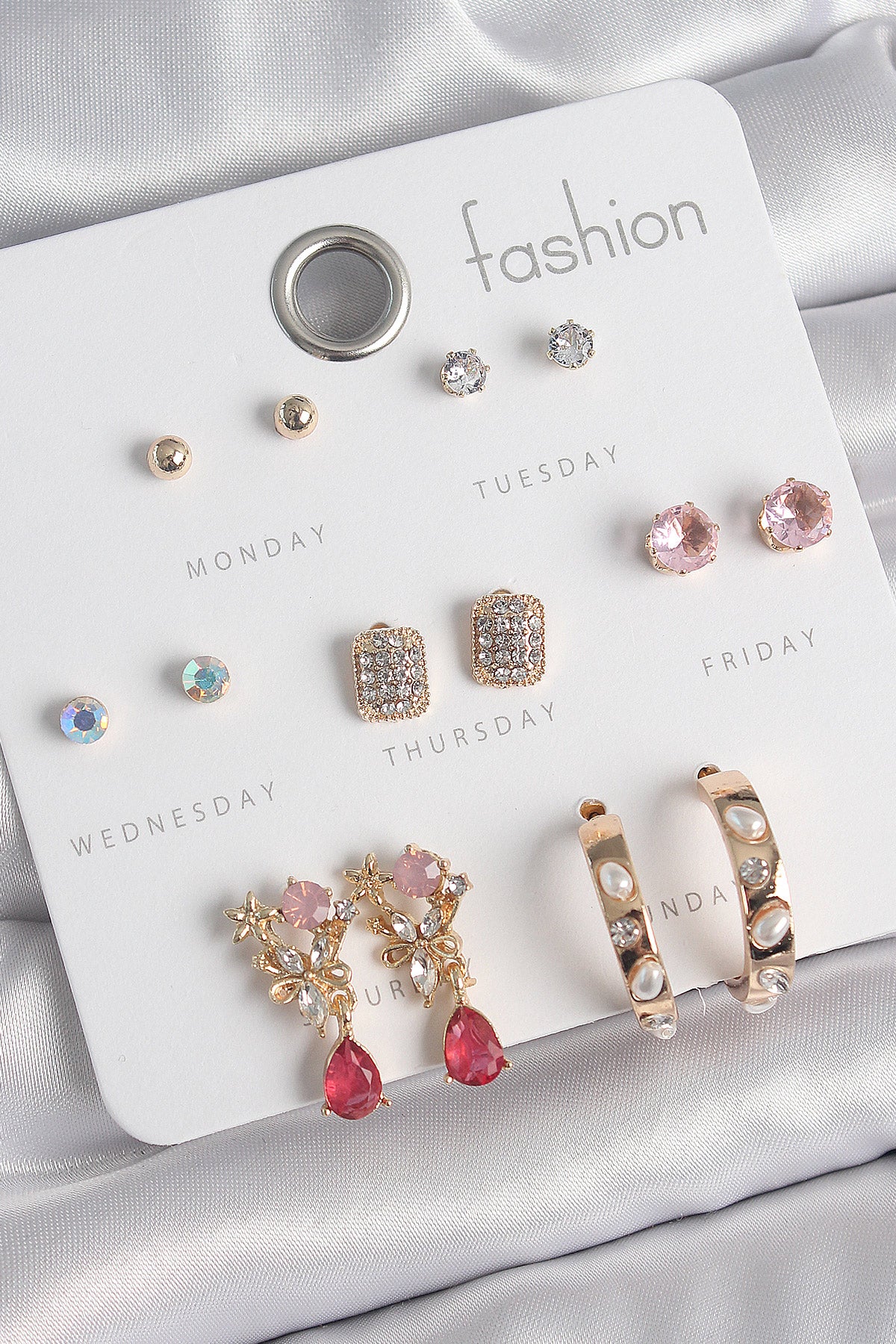 Pirinç Gold Renk Zirkon Taşlı Çiçek Figür İncili Halka Figür 7 Çift Kadın Küpe Seti - BKP10537