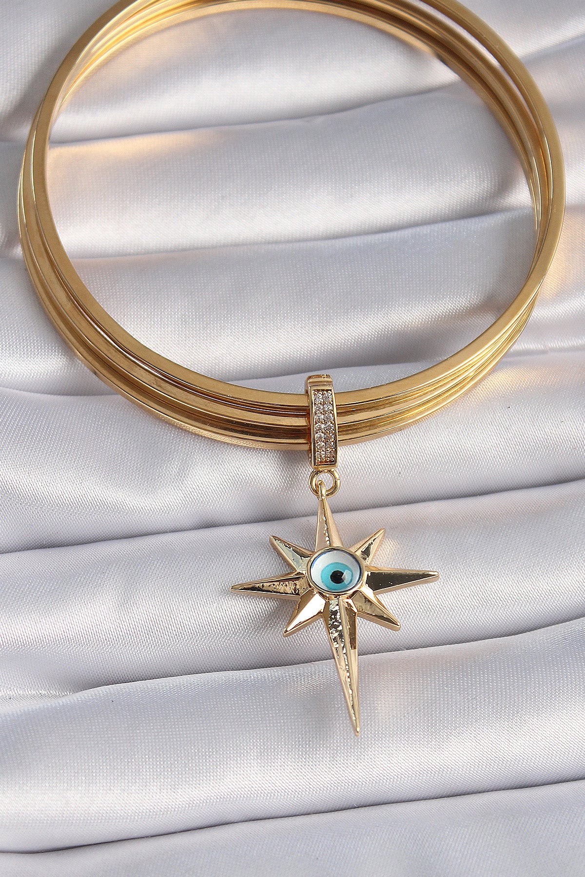 Pirinç Gold Renk Zirkon Taşlı Kutup Yıldızı Nazar Boncuk Detay Ajda Charm - BC1006