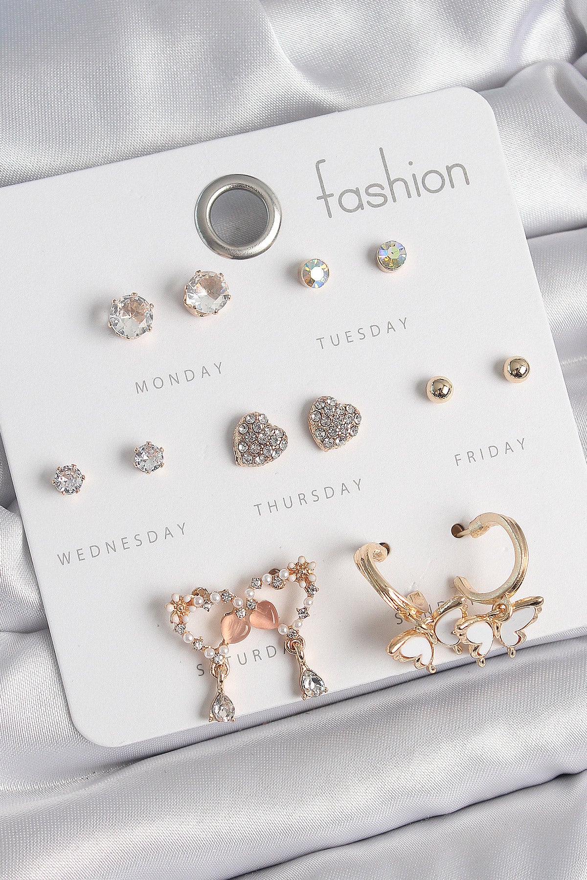 Pirinç Gold Renk Zirkon Taşlı Sallantılı Kalp Figür Kelebek Detay 7 Çift Kadın Küpe Seti - BKP10539