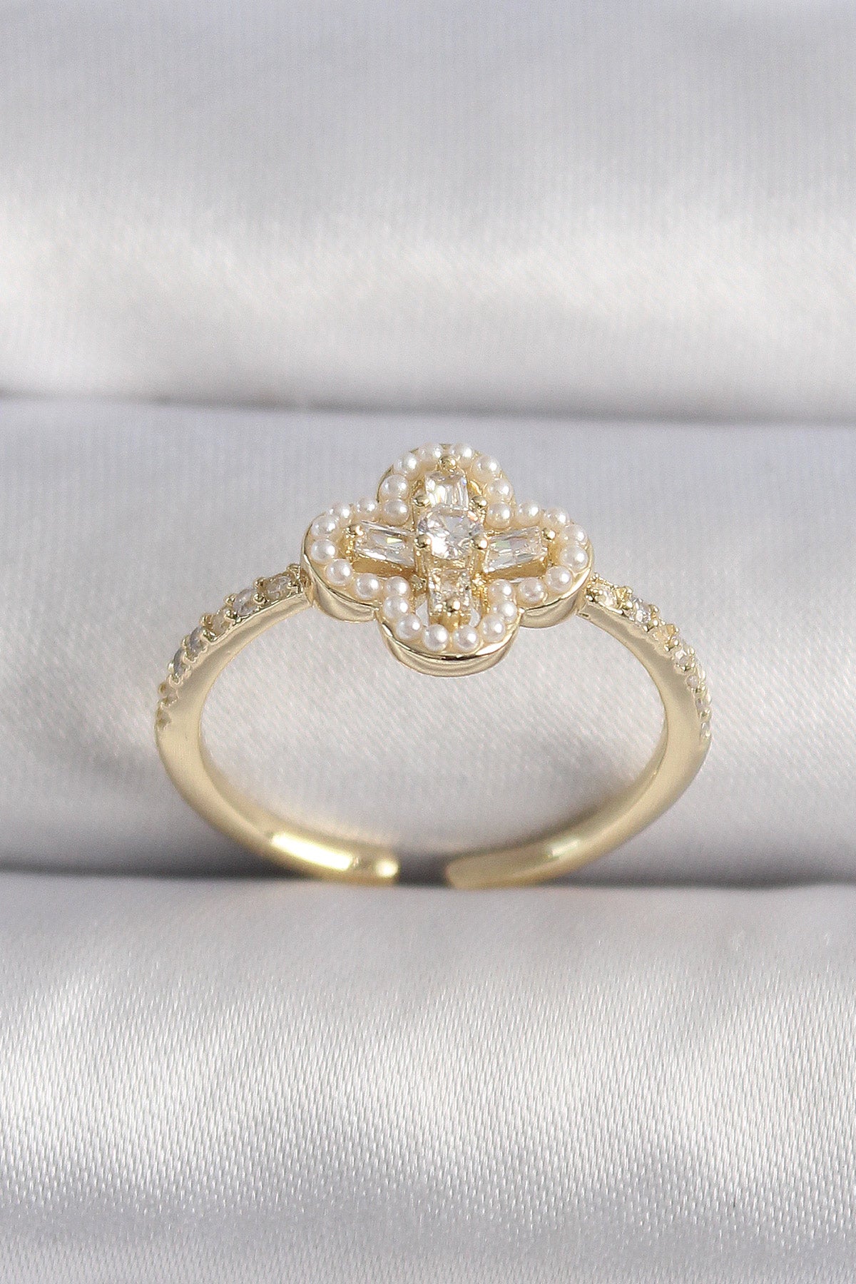 Pirinç Gold Renk Zirkon Taşlı Yonca Model İnci Detay Kadın Yüzük - BYK3494
