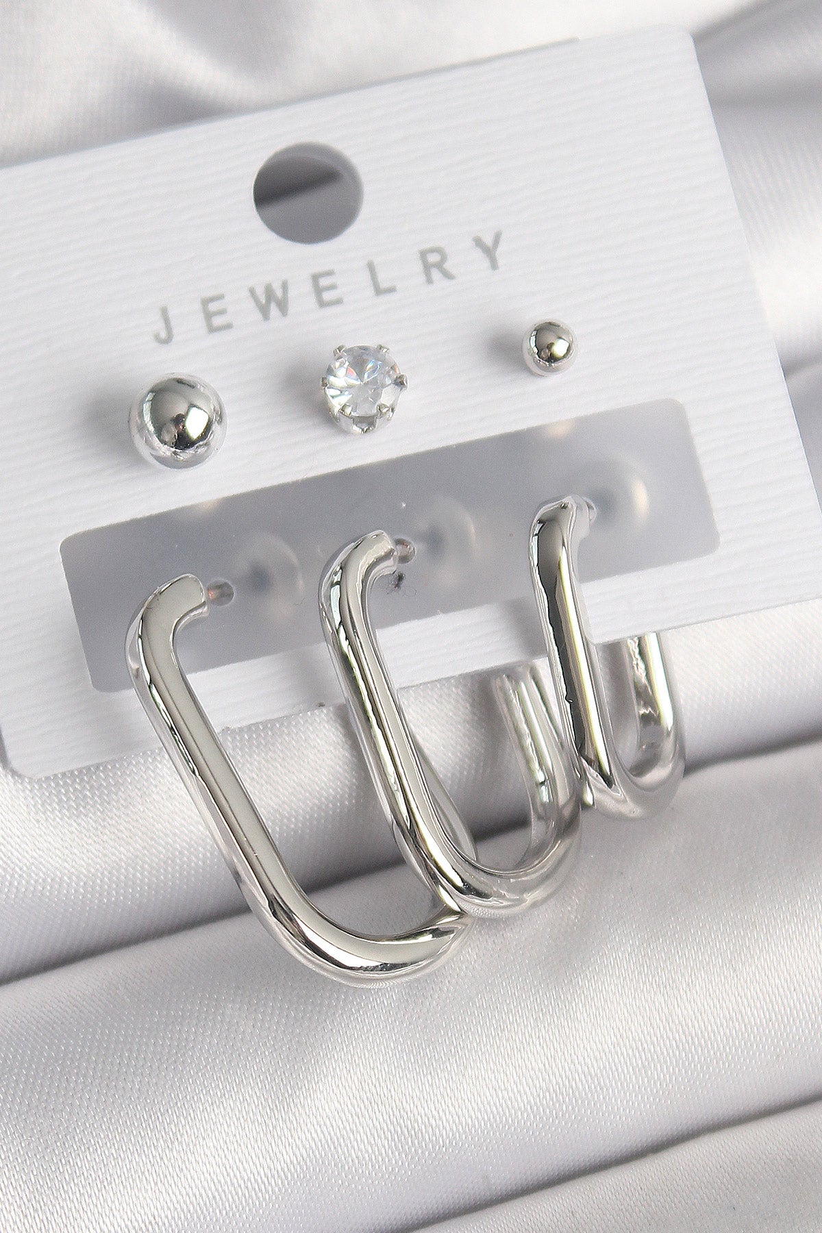 Pirinç Gümüş Renk Halka Model Zirkon Taşlı Topçuk Detay Kadın Küpe Seti - BKP10313