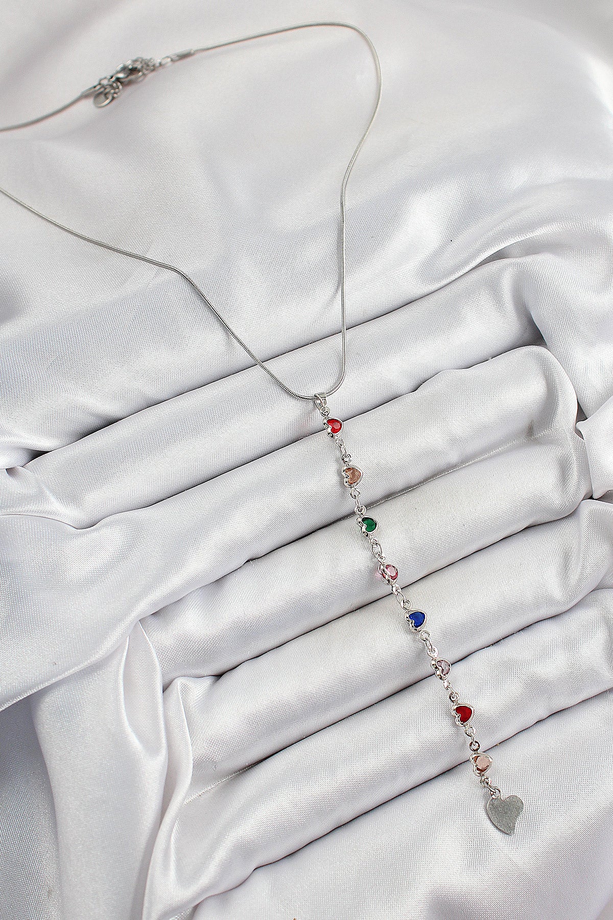 Pirinç Gümüş Renk Karışık Renk Zirkon Taşlı Kalpli Y Kadın Kolye - BKO10338