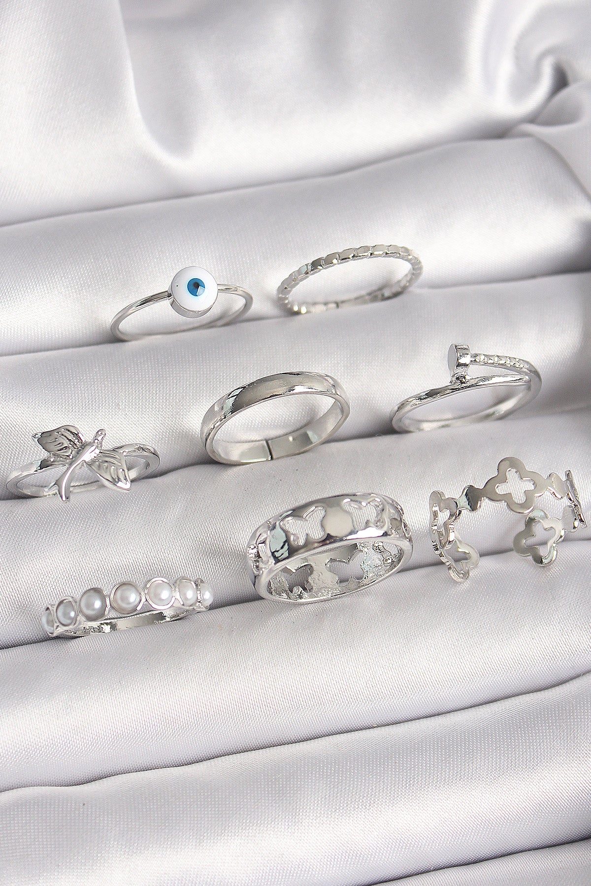 Pirinç Gümüş Renk Nazar Boncuk Detay İncili Kelebek İşlemeli Kadın Yüzük Kombini - BYK3649