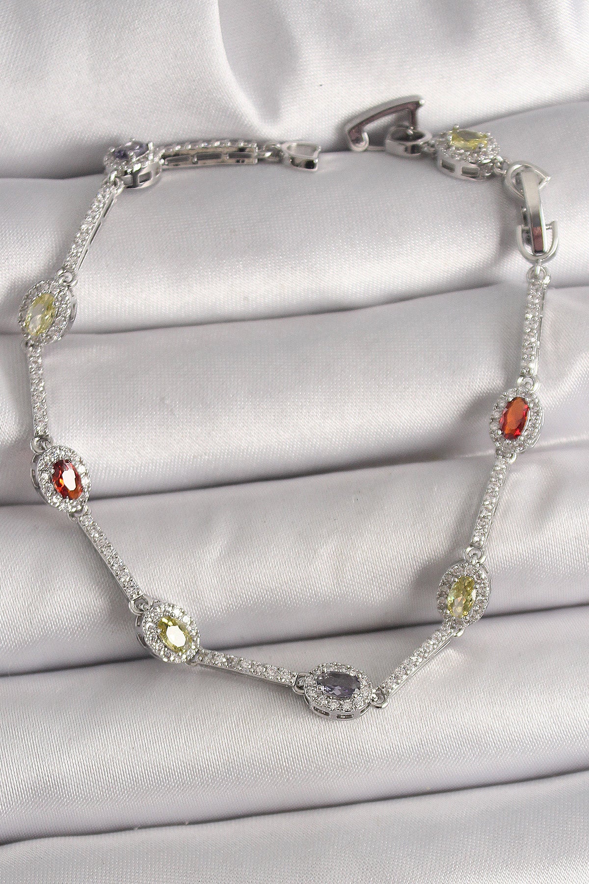 Pirinç Gümüş Renk Renkli Zirkon Taşlı Damla Taş Model Kadın Bileklik - BB6873