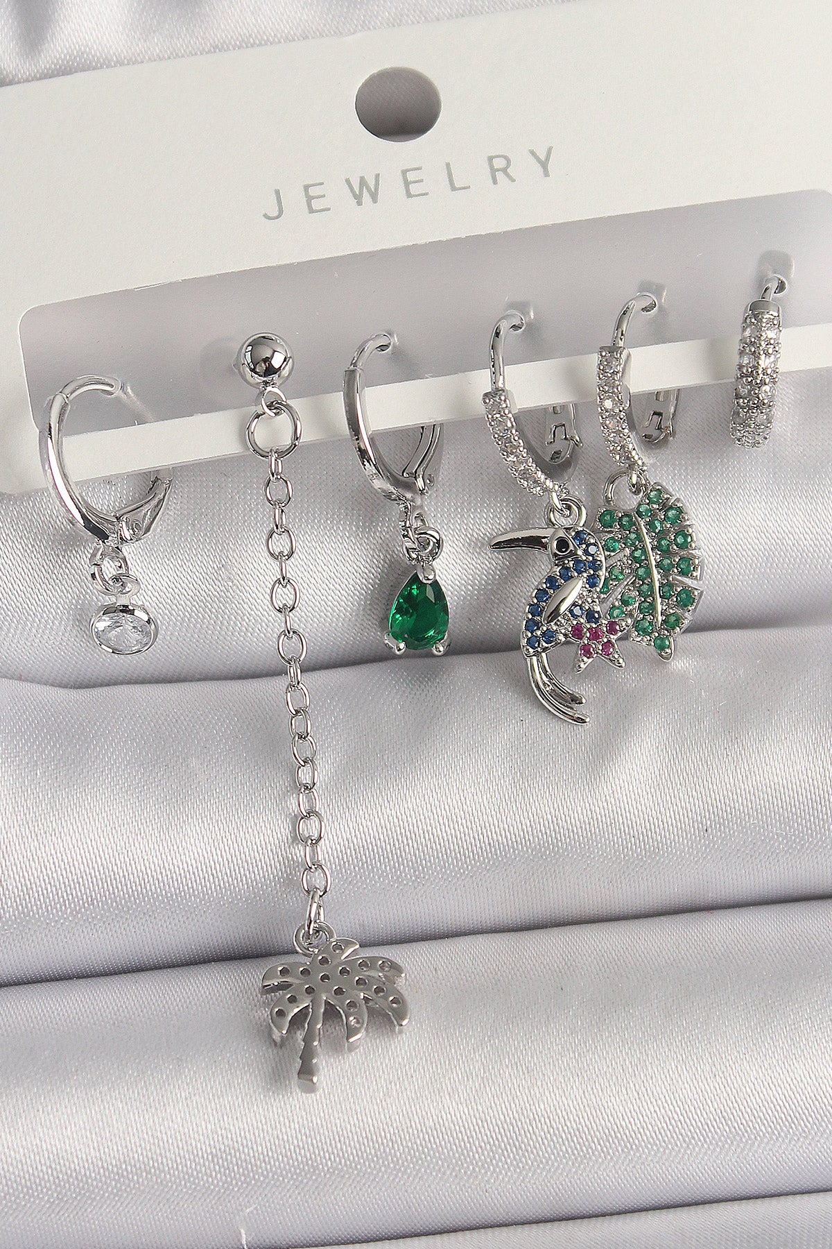 Pirinç Gümüş Renk Sallantı Zirkon Taşlı Ağaç Figür Çoklu Kadın Küpe Seti - BKP10119