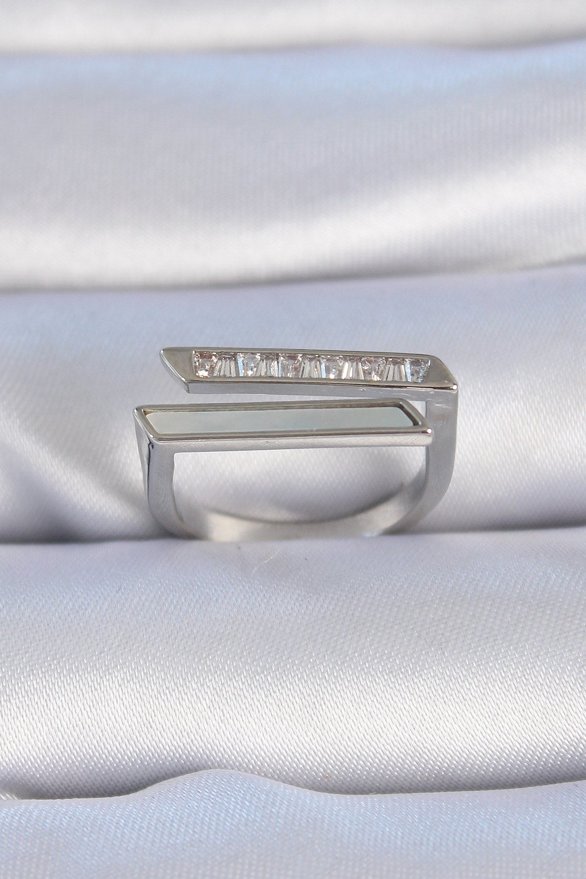 Pirinç Gümüş Renk Zirkon Taşlı Beyaz Sedef Detay Kadın Yüzük - BYK3349