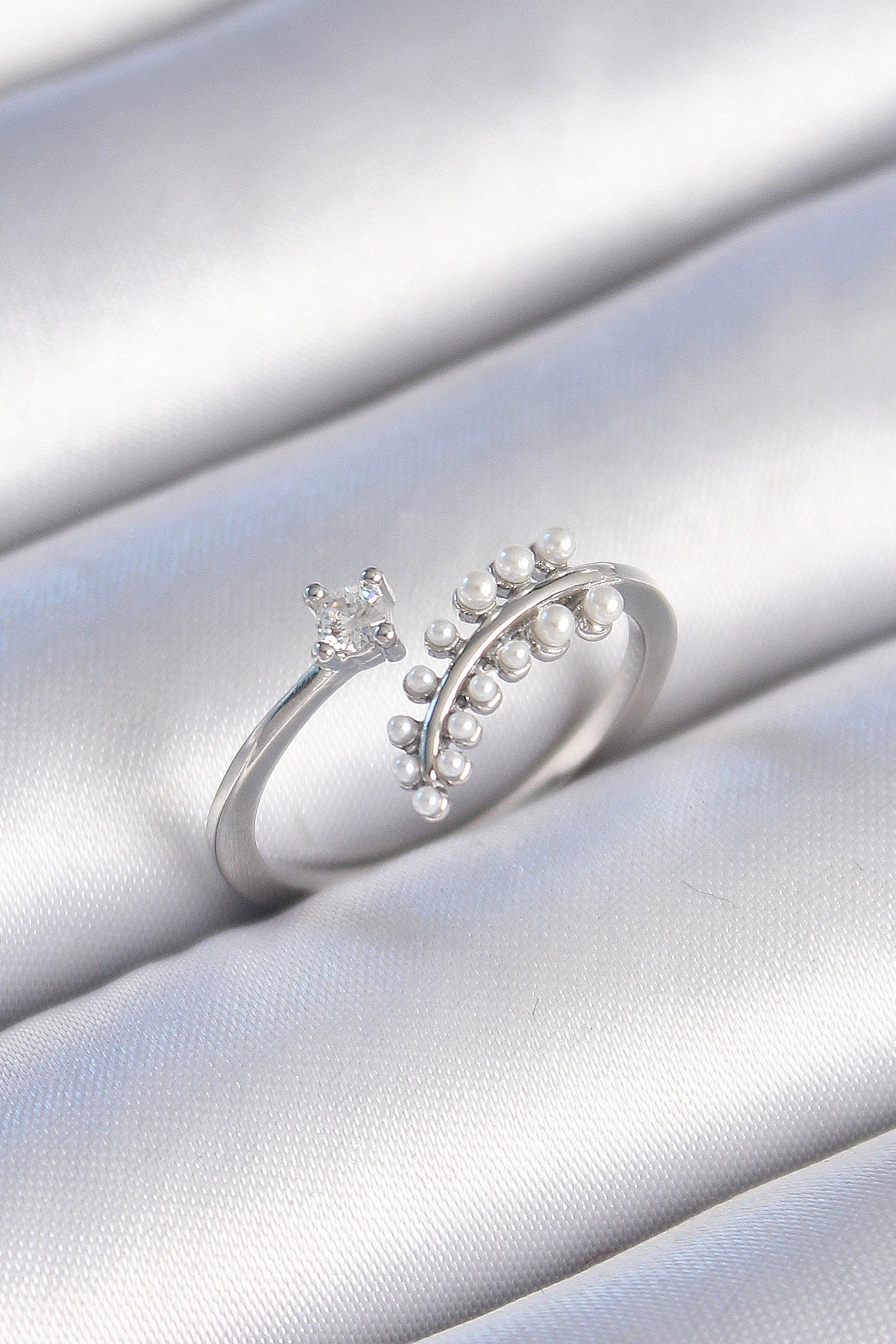 Pirinç Gümüş Renk Zirkon Taşlı İncili Yaprak Model Kadın Yüzük - BYK3453