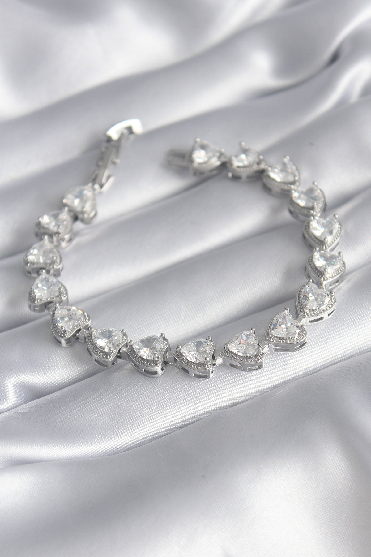 Pirinç Gümüş Renk Zirkon Taşlı Kalp Model VIP Seri Kadın Bileklik - BB5844
