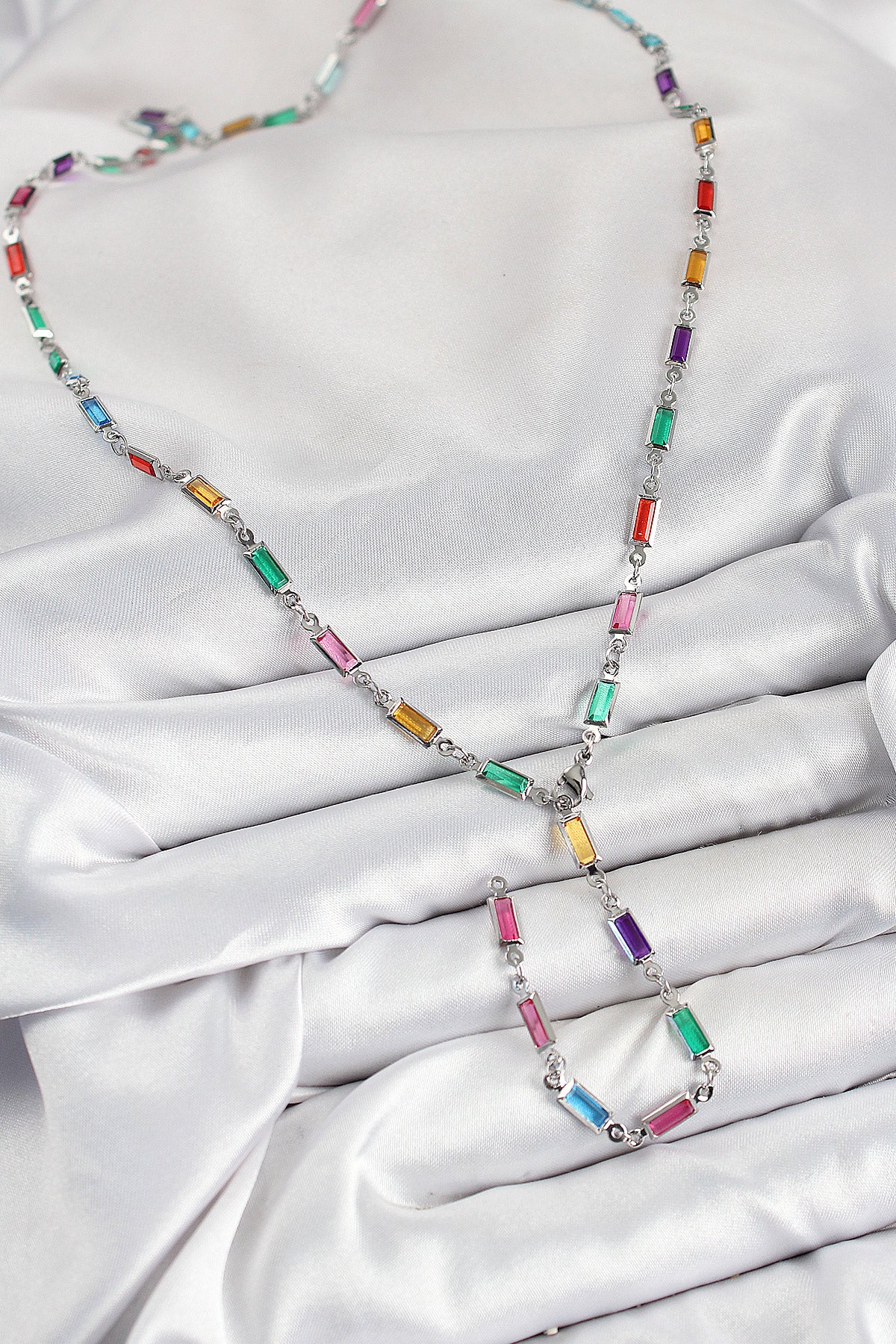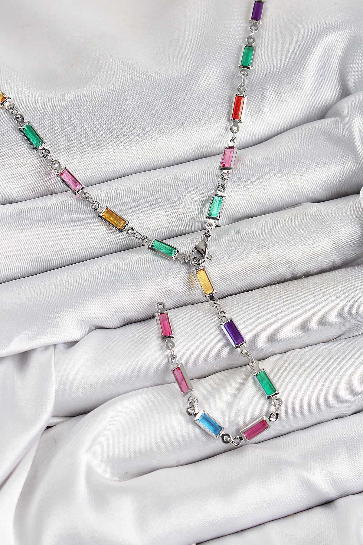 Pirinç Renkli Zirkon Taşlı Dikdörtgen Model Gümüş Renk Kadın Y Kolye - BKO10385