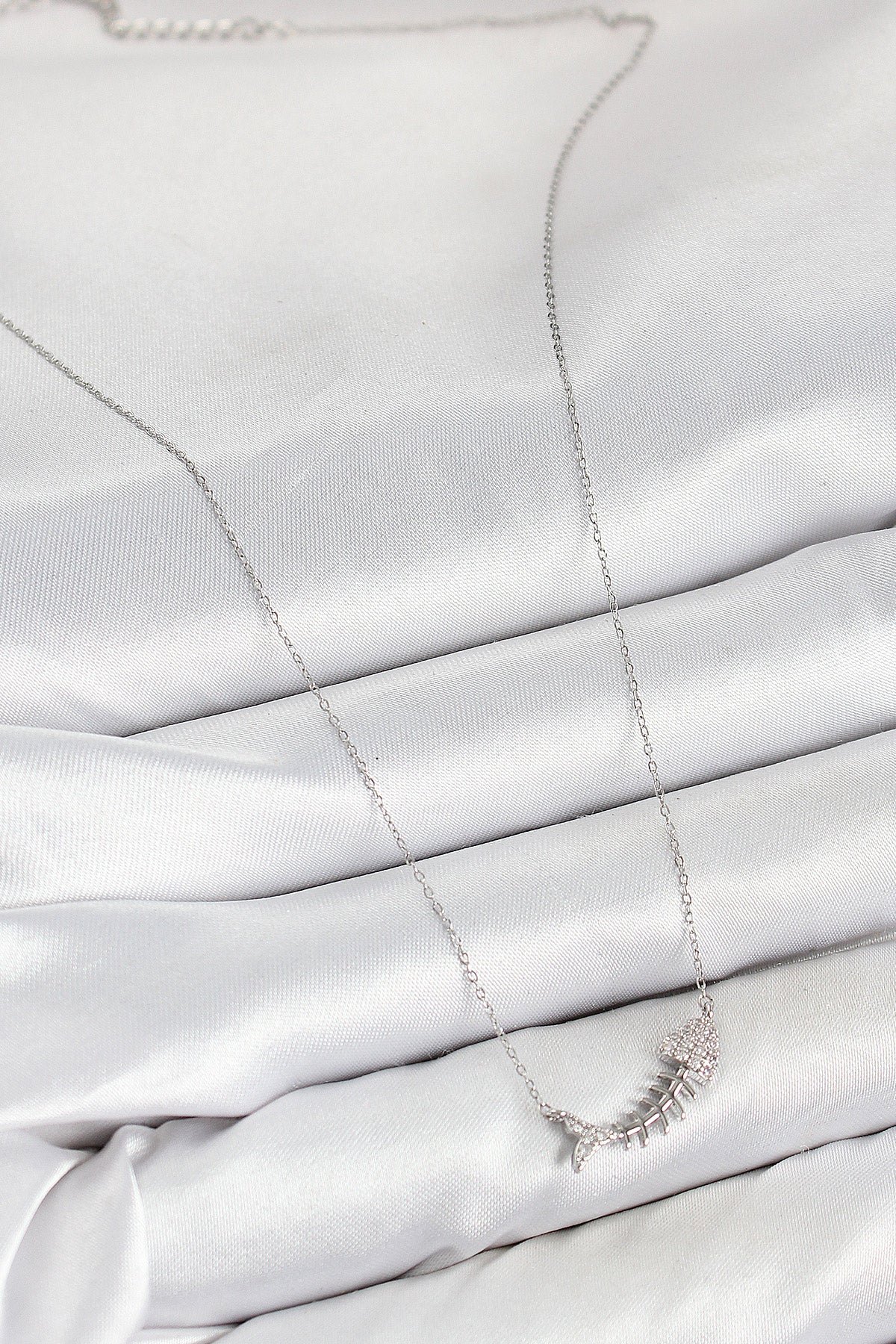 Pirinç Zirkon Taşlı Balık Kılçığı Model Gümüş Renk Kadın Kolye - BKO10413