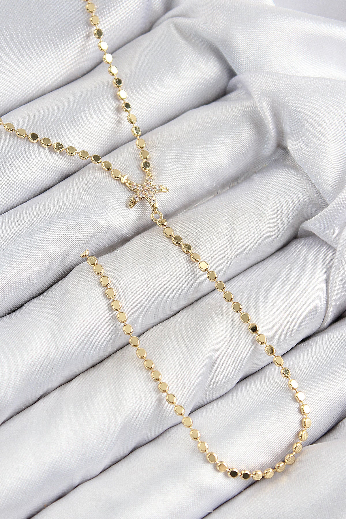 Pirinç Zirkon Taşlı Ezme Zincirli Deniz Yıldızı Model Gold Renk Y Kolye - BKO10467