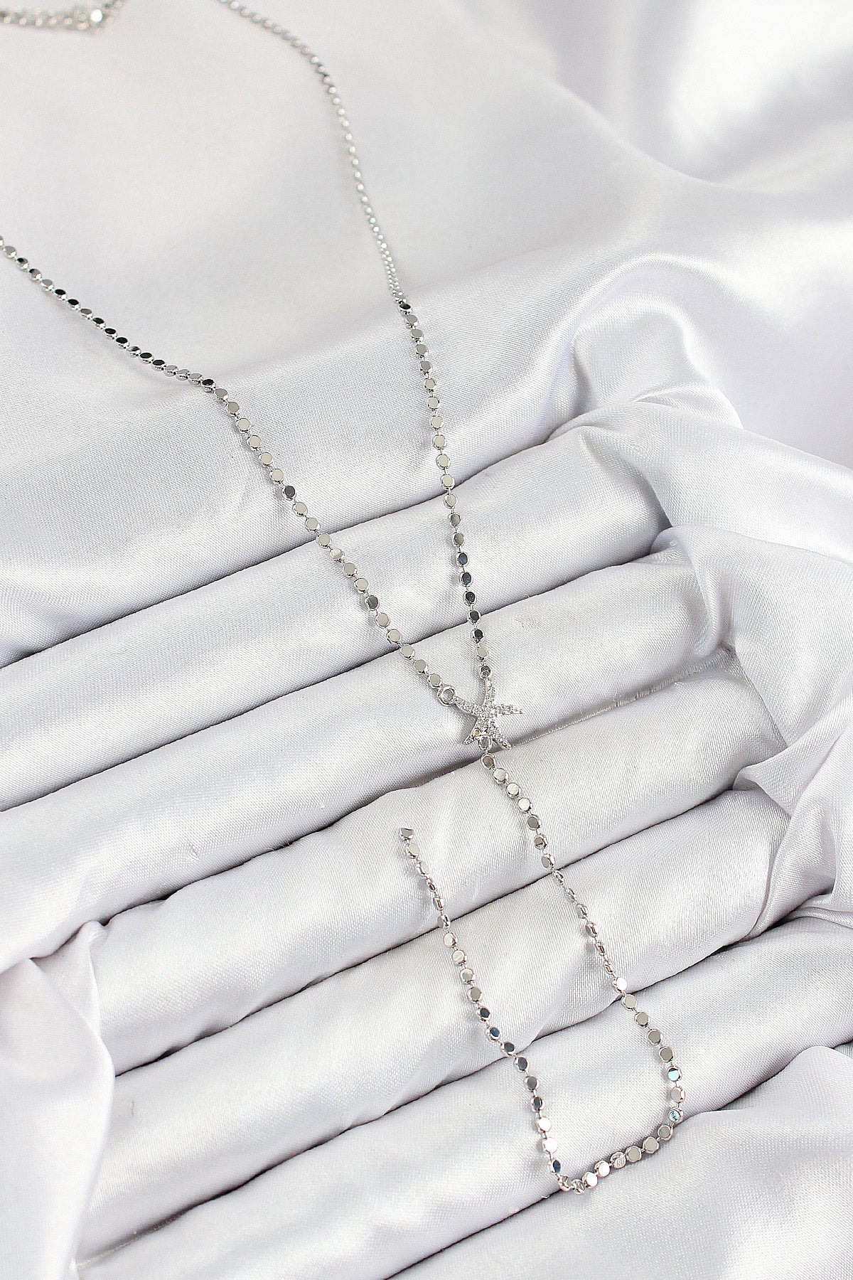 Pirinç Zirkon Taşlı Ezme Zincirli Deniz Yıldızı Model Gümüş Renk Y Kolye - BKO10466