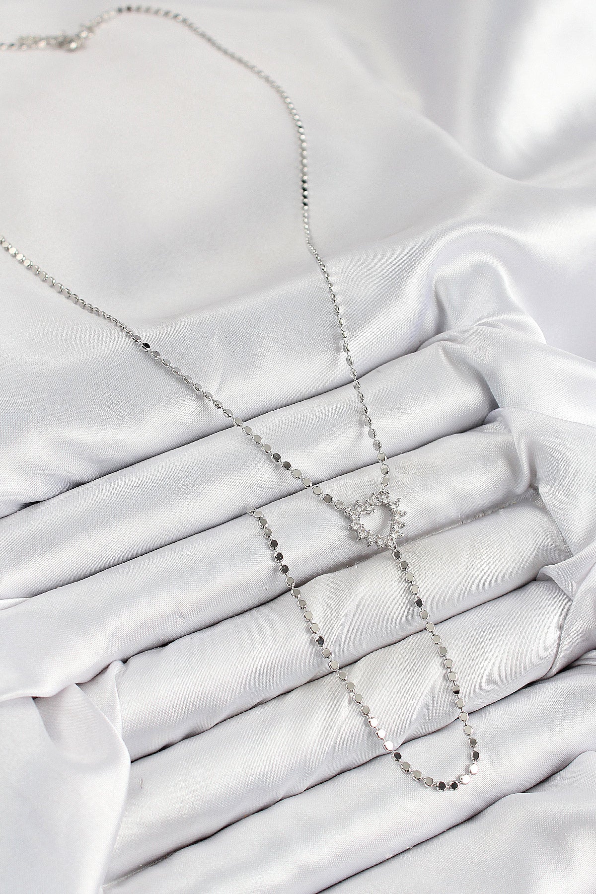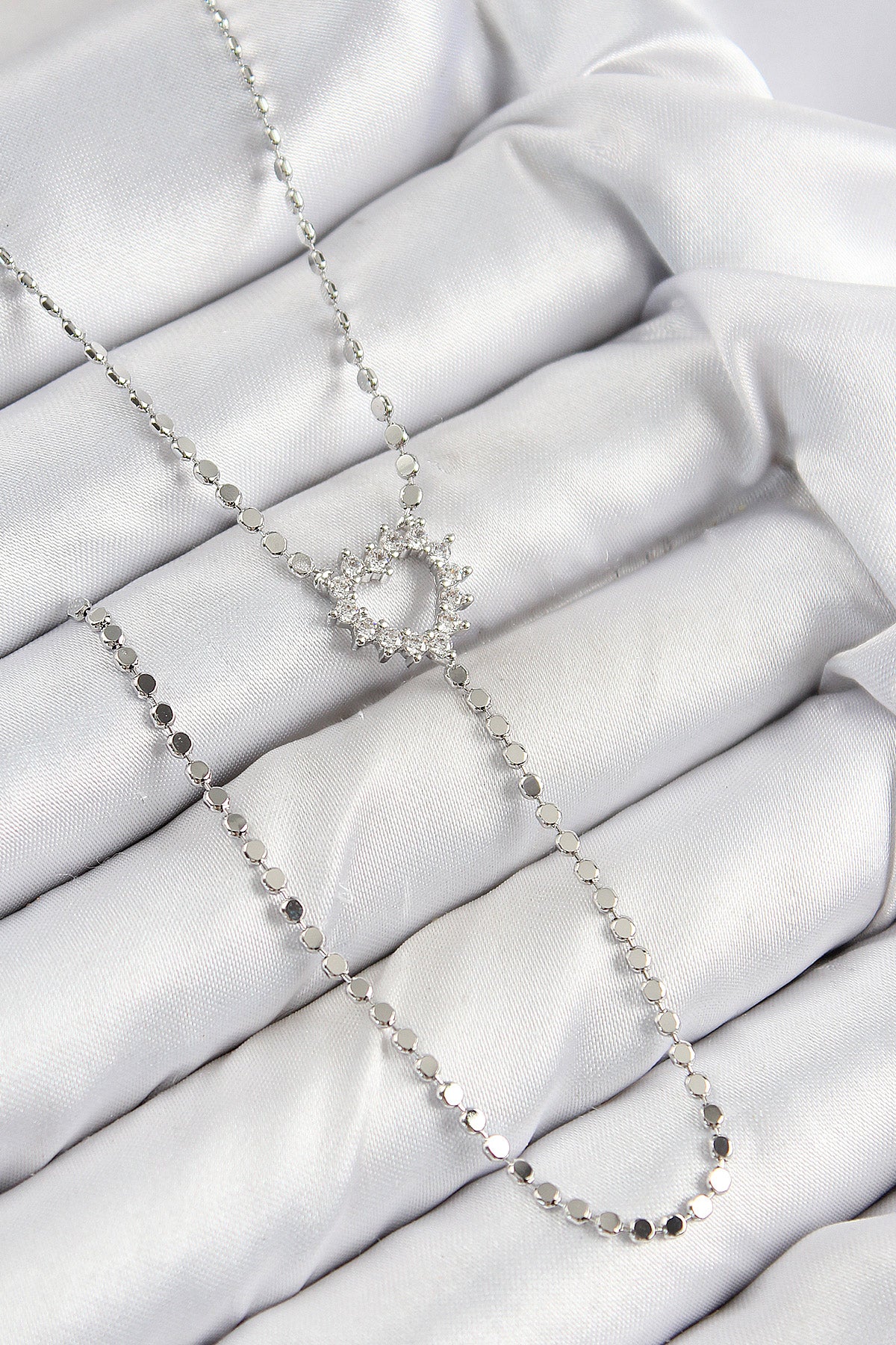Pirinç Zirkon Taşlı Ezme Zincirli Kalp Model Gümüş Renk Y Kolye - BKO10460