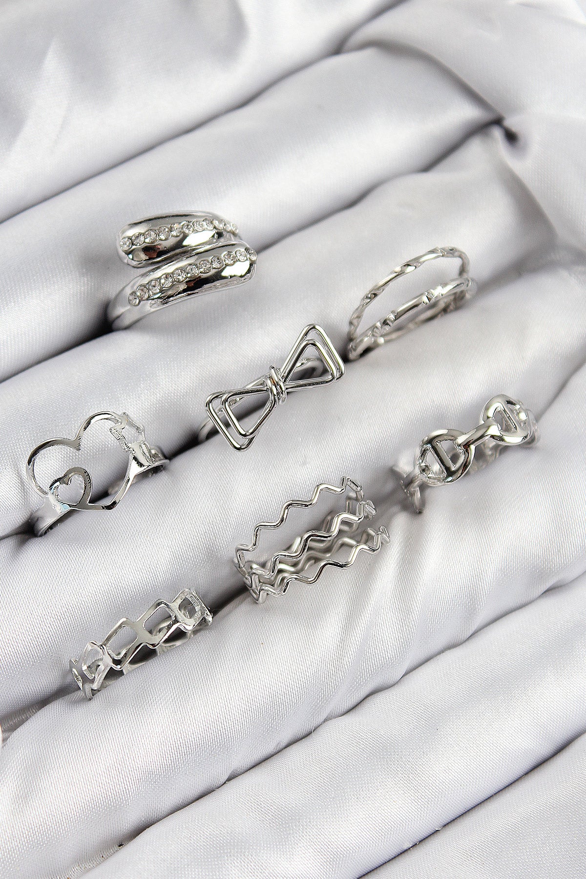 Pirinç Zirkon Taşlı Fiyonk Ve Kalp Model Gümüş Renk Kadın Yüzük Kombin Set - BYK3822