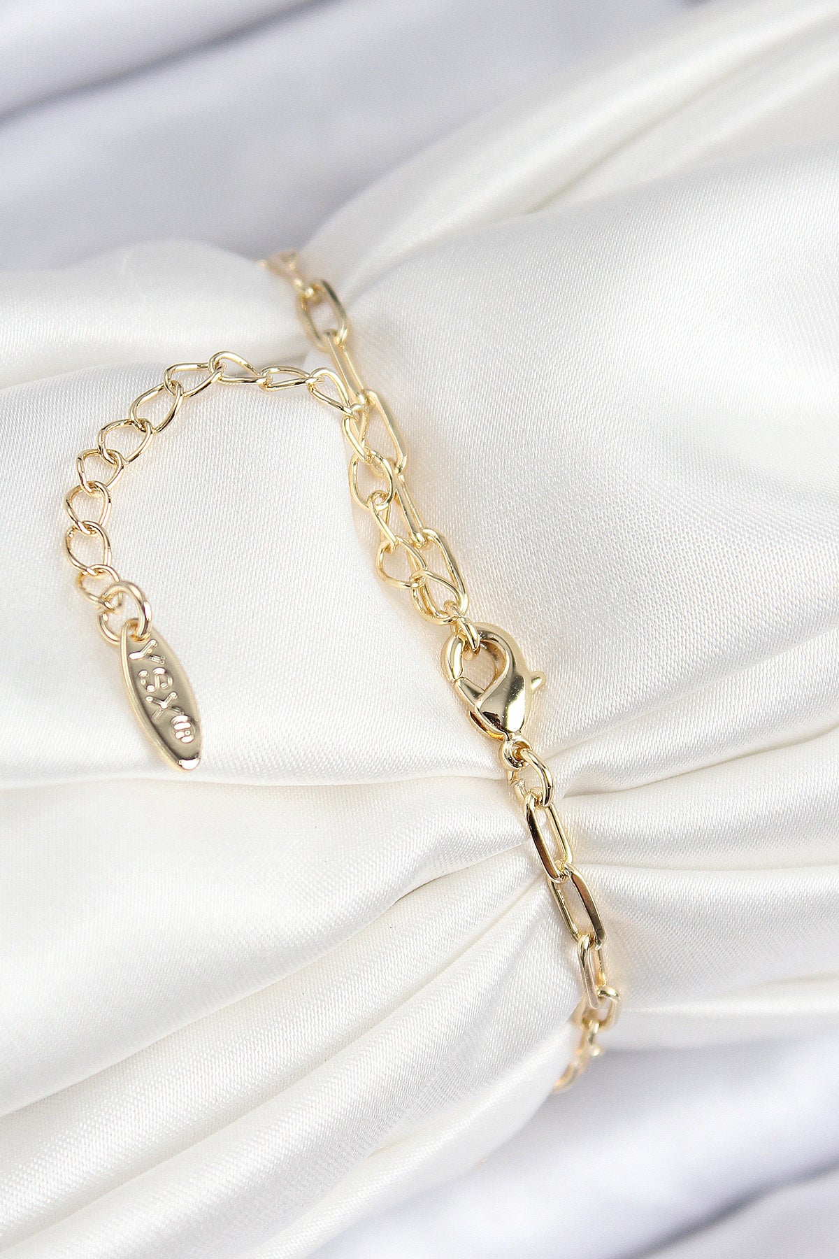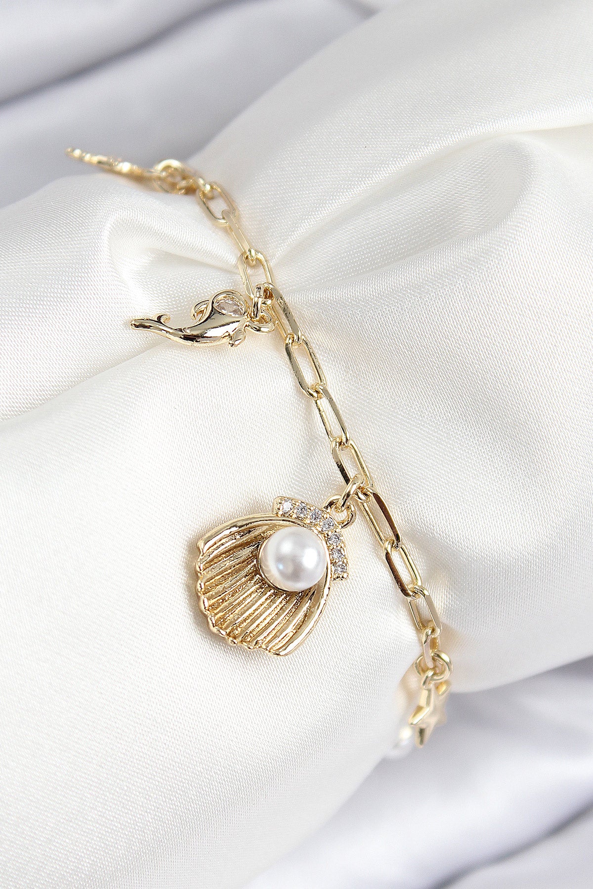 Pirinç Zirkon Taşlı İncili İstiridye Model Gold Renk Kadın Bileklik - BB7774