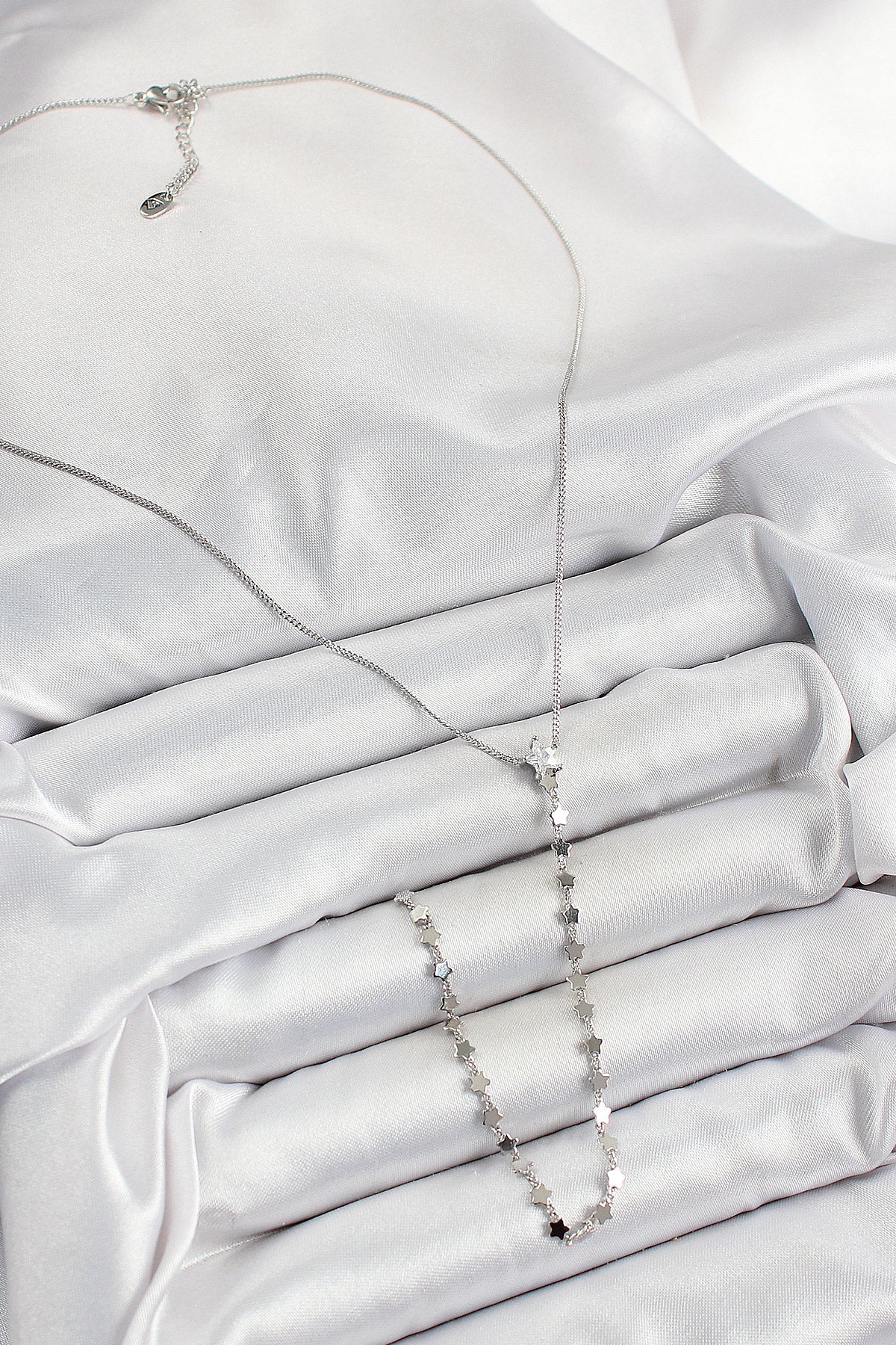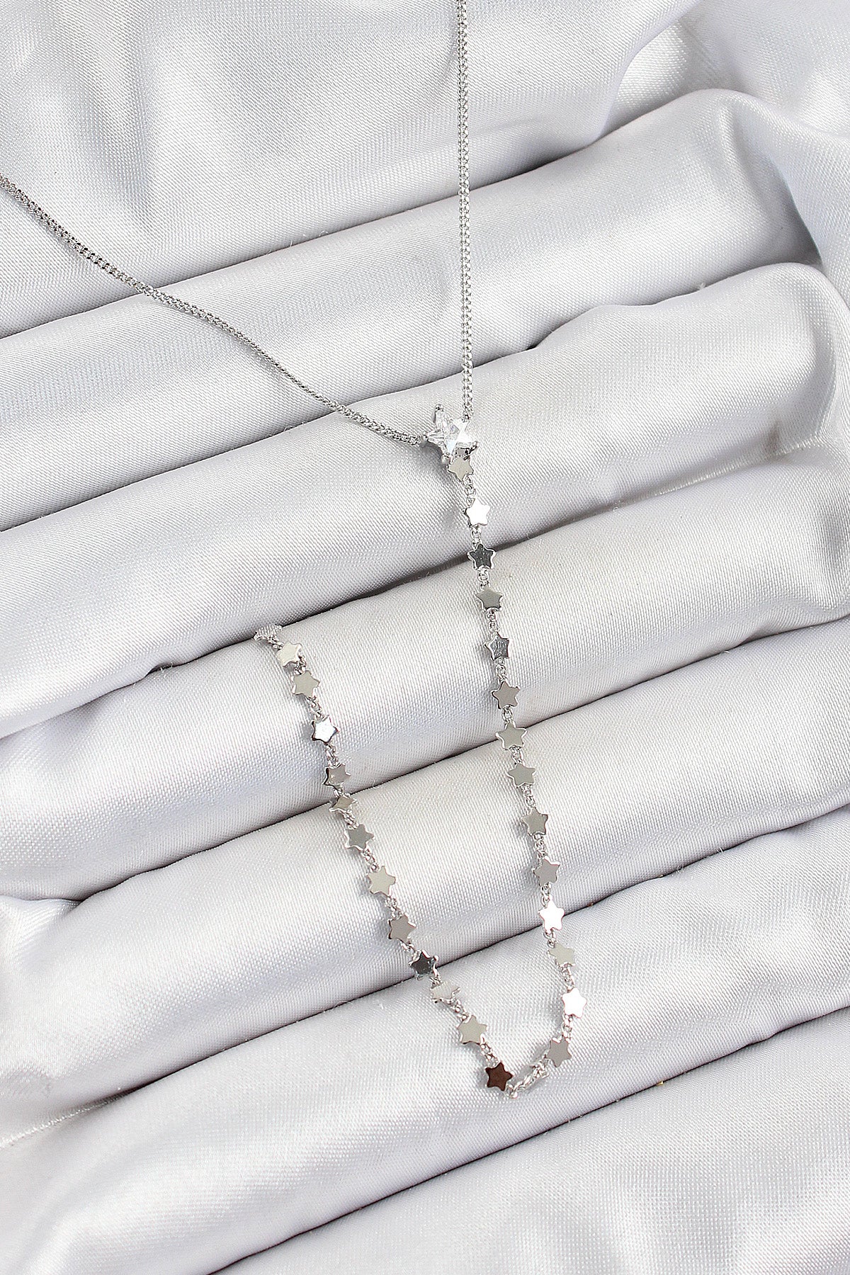 Pirinç Zirkon Taşlı Yıldız Figürlü Y Model Gümüş Renk Kadın Kolye - BKO10309