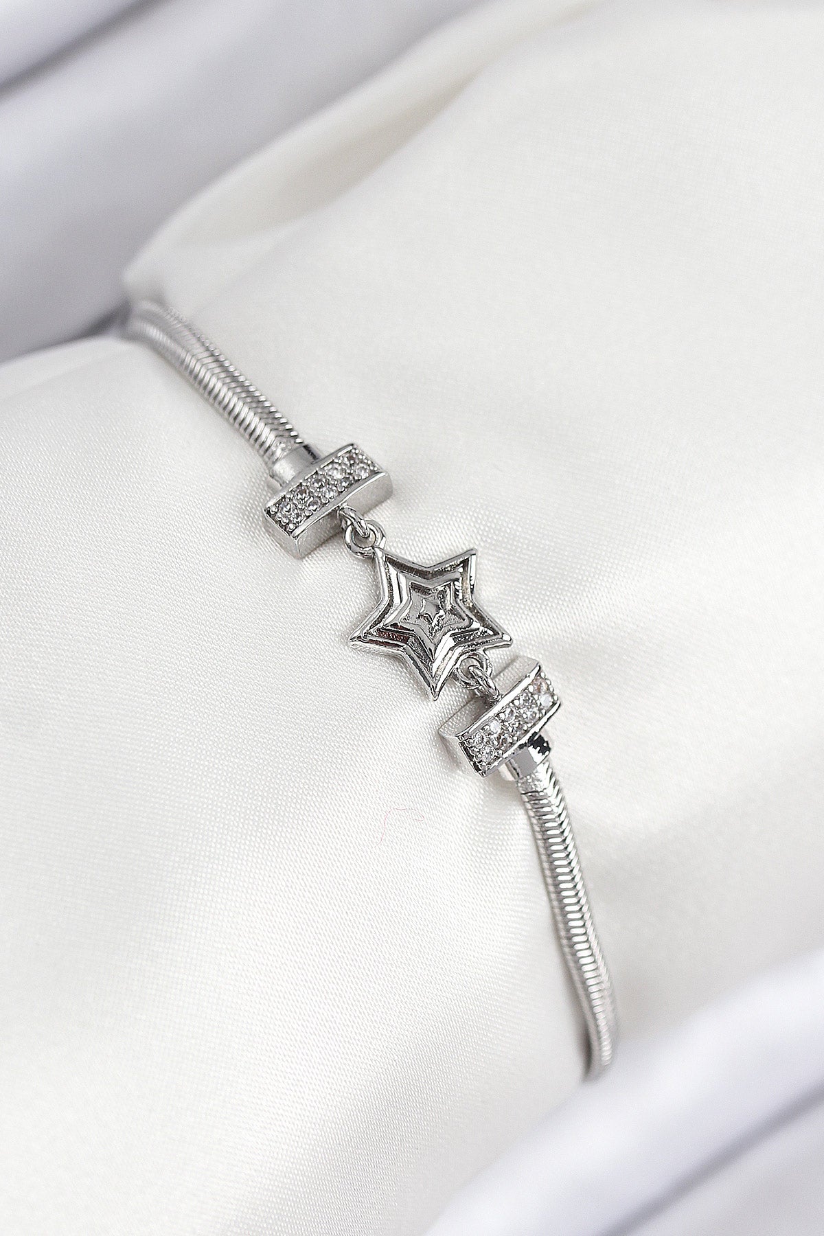 Pirinç Zirkon Taşlı Yıldız Model Gümüş Renk Kadın Bileklik