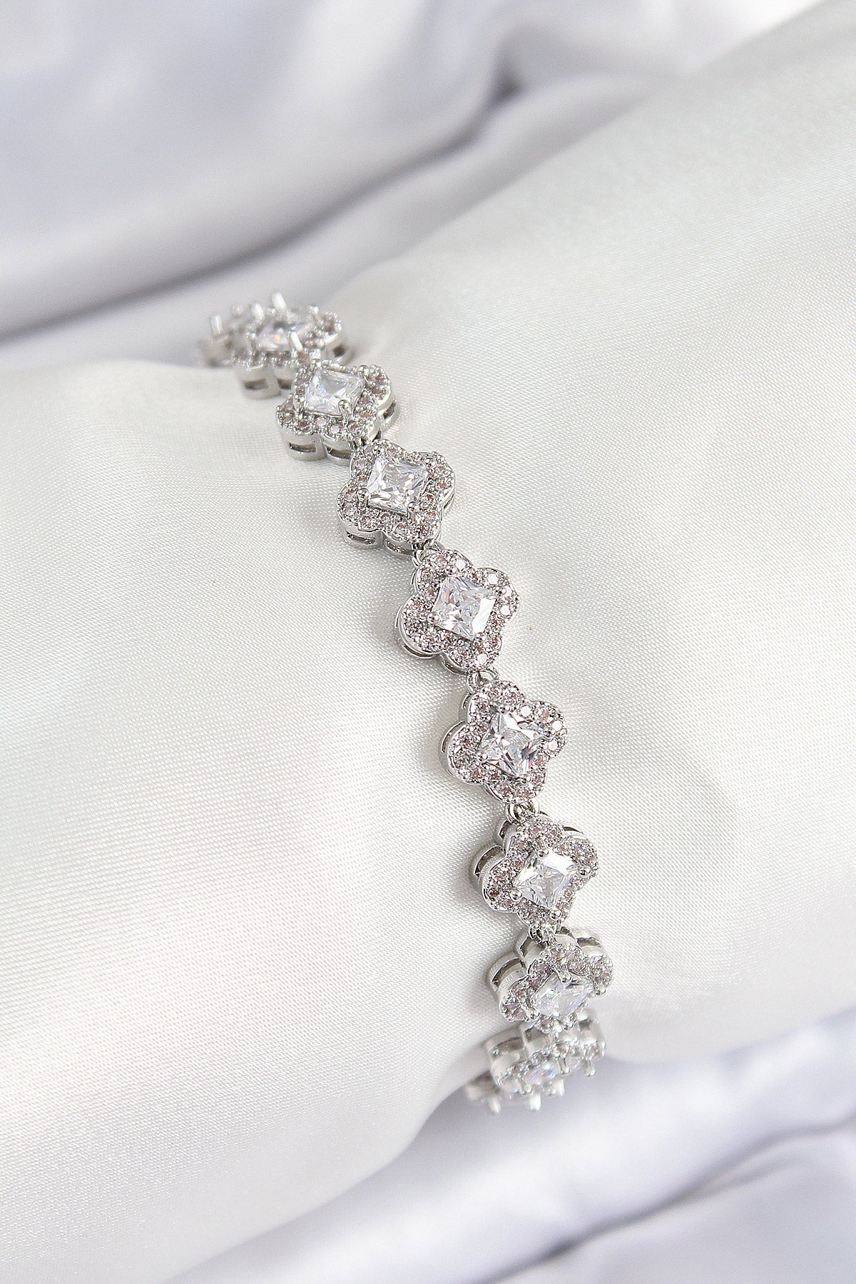 Pirinç Zirkon Taşlı Yonca Baget Model Gümüş Renk VIP Seri Kadın Bileklik - BB7509