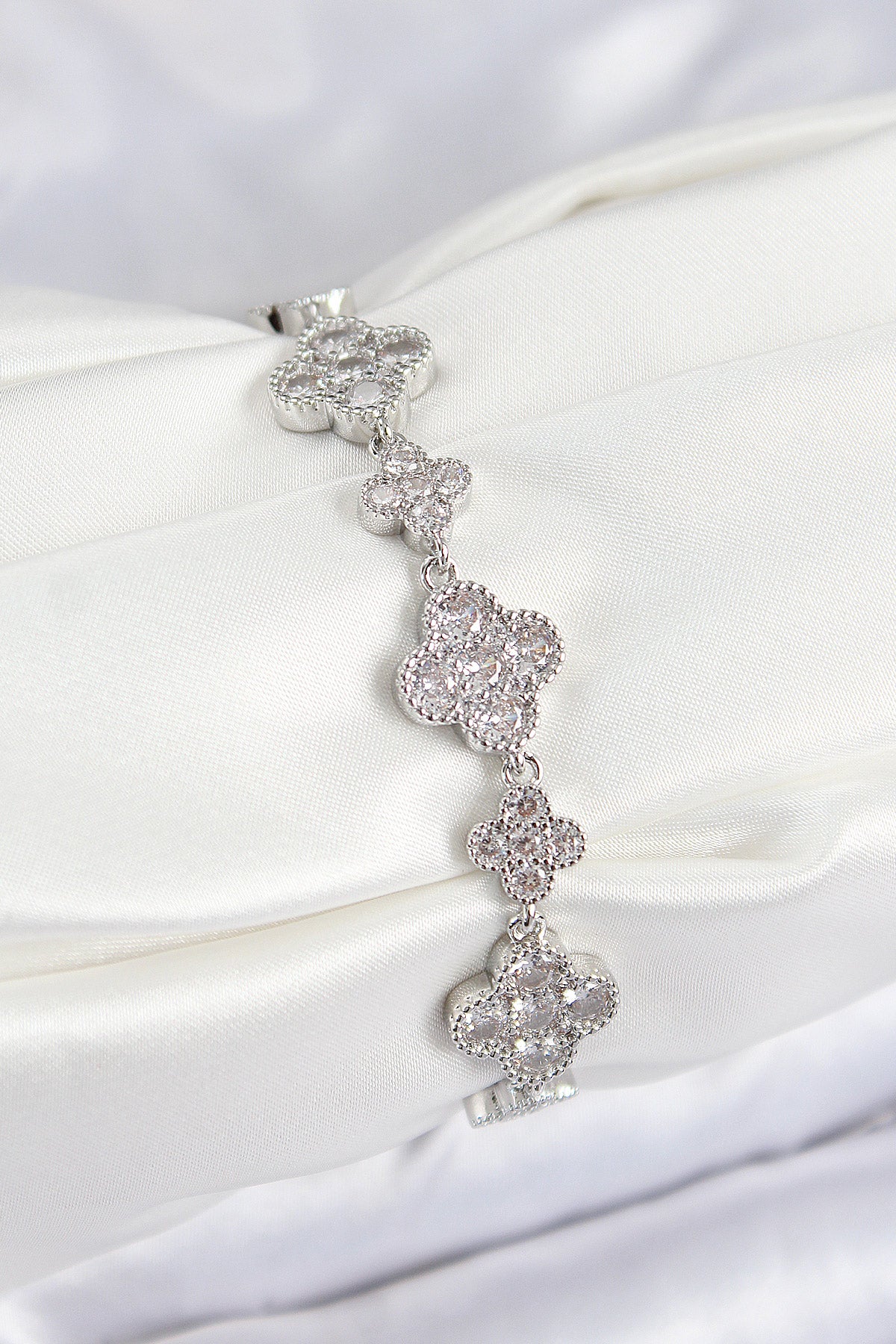 Pirinç Zirkon Taşlı Yonca Model Gümüş Renk VIP Seri Kadın Bileklik - BB7521